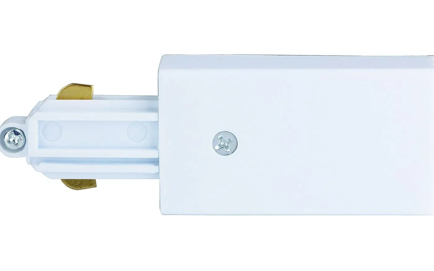 Vit anslutningskontakt, från Malmbergs, för 1-fas skena. Denna anslutning placeras i valfri ände av skena för att ansluta ström till ditt skensystem. (Jord höger)