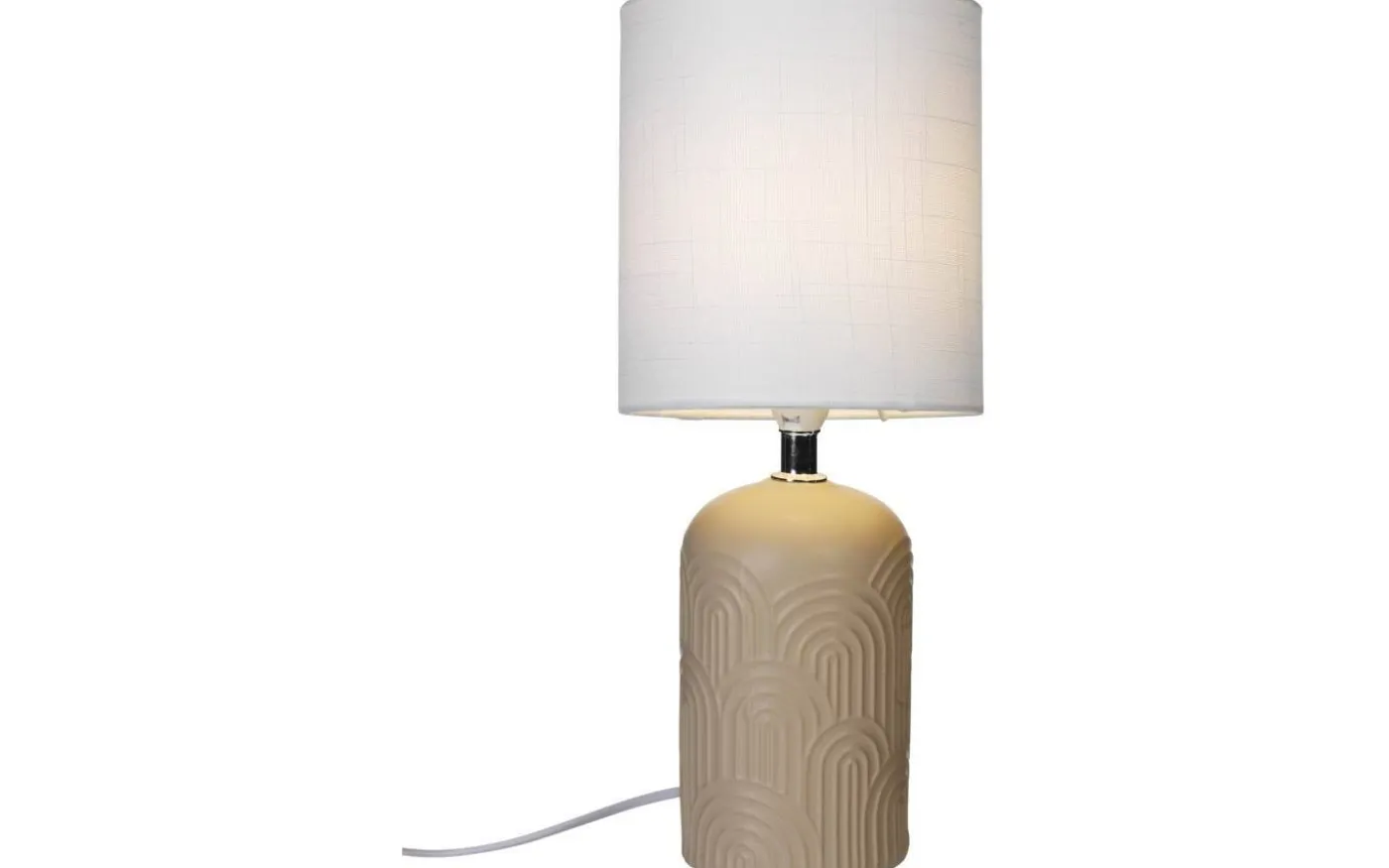 Archie bordslampa från Cottex har en mönstrad lampfot i keramik kombinerad med en vit textilskärm. Levereras med 1,4m lång anslutningskabel med strömbrytare och stickkontakt för vägguttag.