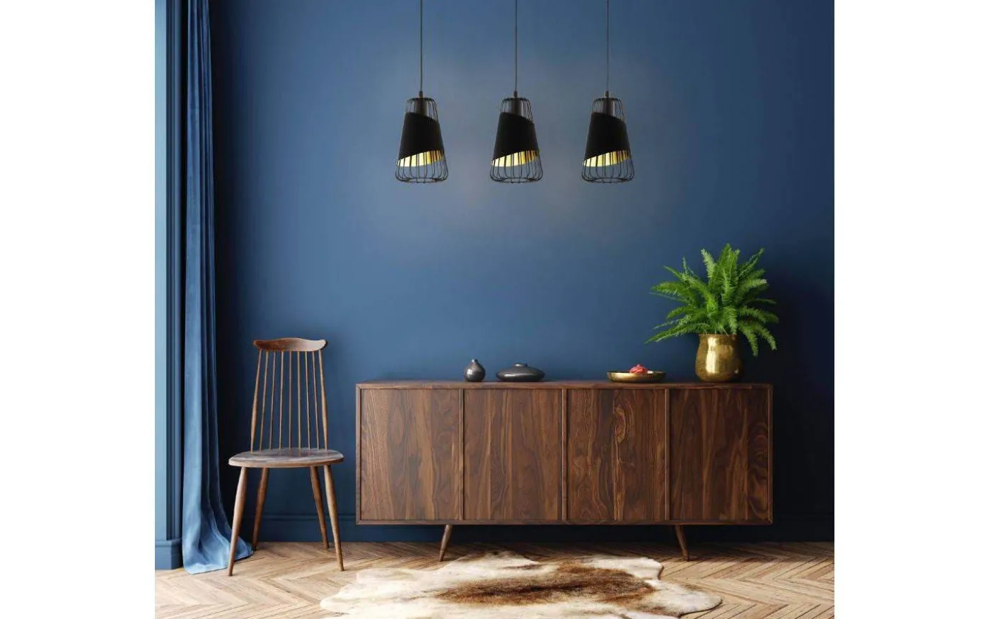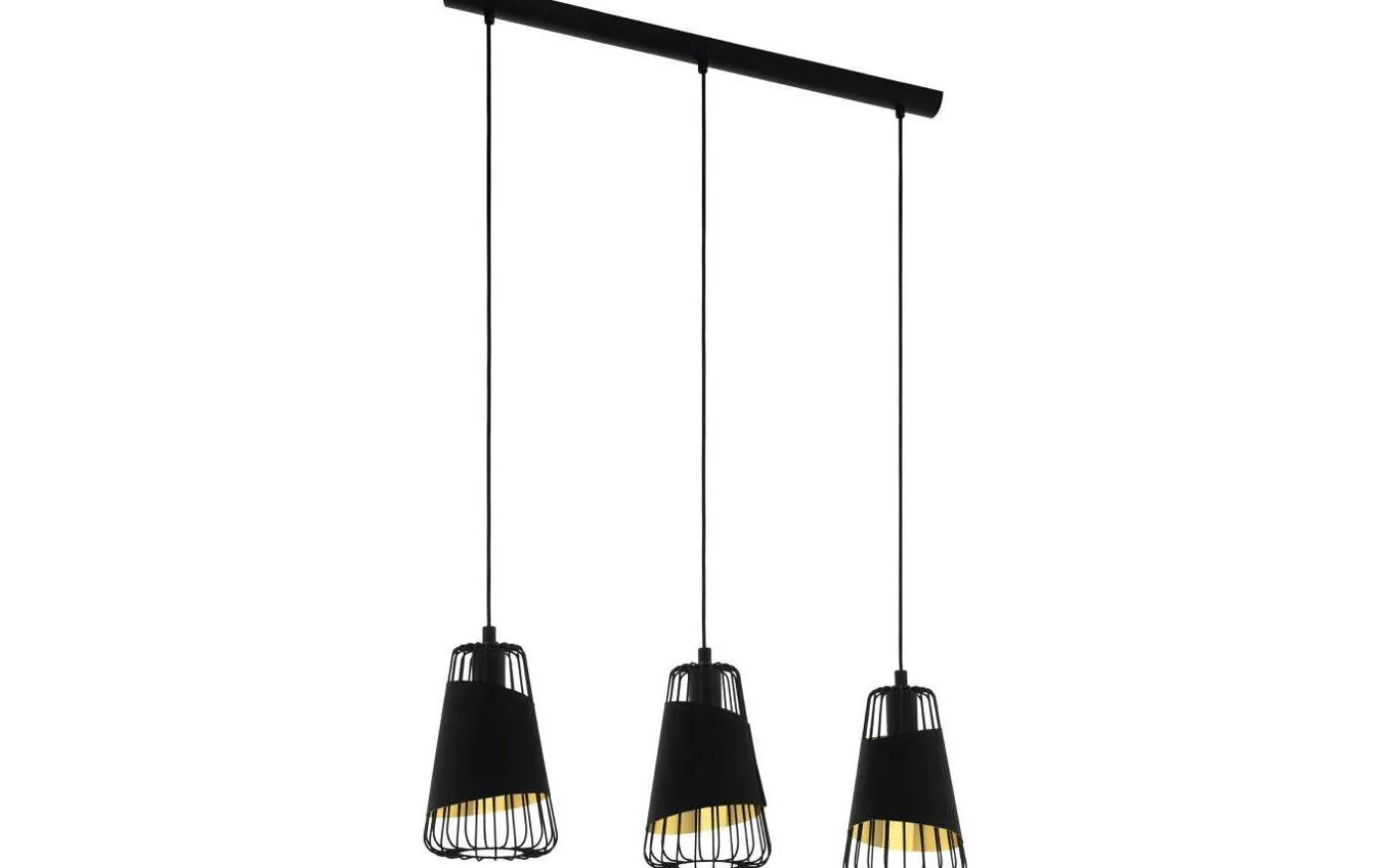 Austell taklampa från Eglo är en snyggt designad taklampa av stål med svart finish. Taklampan har 3st pendlar med metallskärm. Varje skärm har en svart mjuk detalj med guldfärgad insida som ger en härlig avspegling när lampan är tänd.