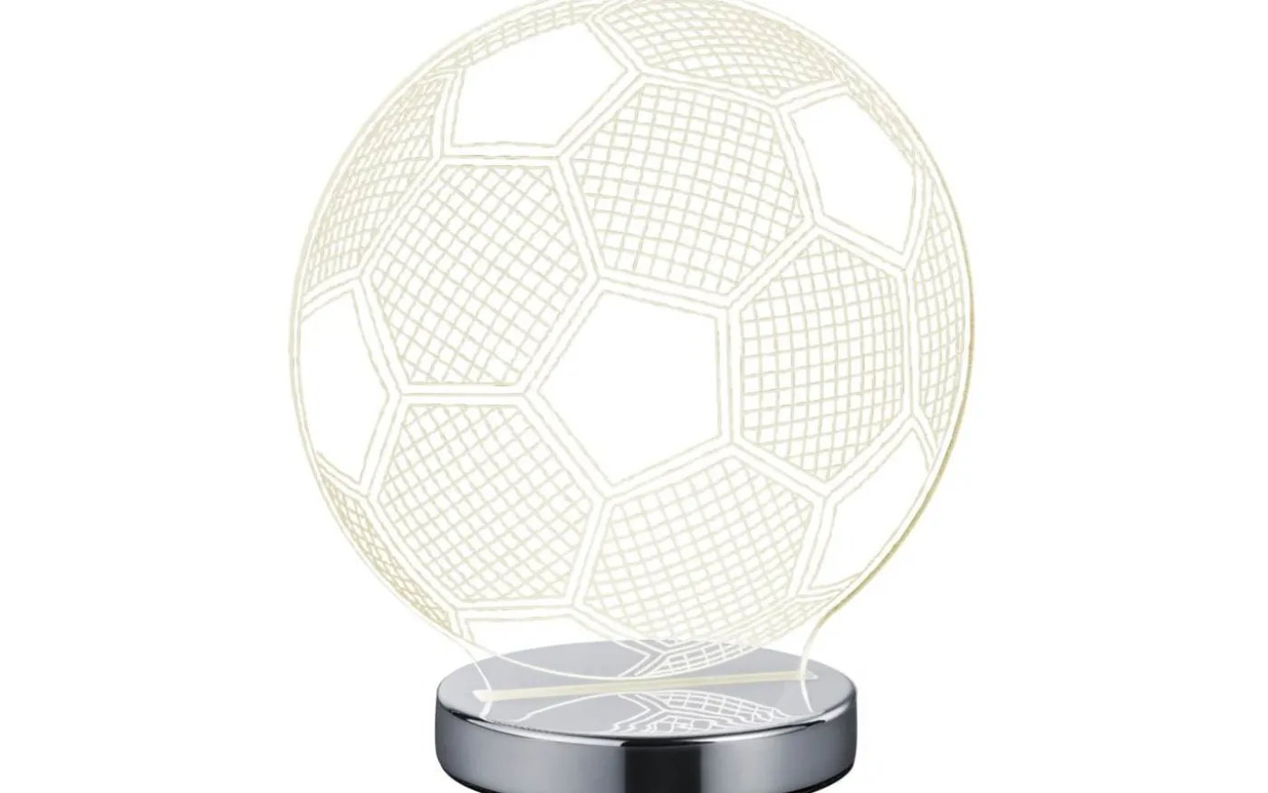 Bordslampan med 3D-effekt är inte så mycket för riktad belysning som för ett riktigt dekorativt hemligt vapen. BALL-bordslampan i fotbollsdesign bör placeras framträdande i interiören, eftersom den är en höjdpunkt när den slås på och av. Ljusfärgen kan också justeras med den vanliga sladdströmbrytaren. Färgen kan justeras stegvis från 3000, 4000 eller 5000 Kelvin med korta på/av-processer. Lamphuvudet i klar akryl är monterat på en kromfärgad bas och mäter ca 22×22 cm. Den integrerade LED-ljuskällan avger kraftfulla 400 lumen eller 7 watt. Ljuskälla: inklusive 1x SMD LED, 7W · 1x 600lm, 3000+4000+6500K. Extra information: Justerbar ljusfärg, Kabelströmbrytare, Ej dimbar