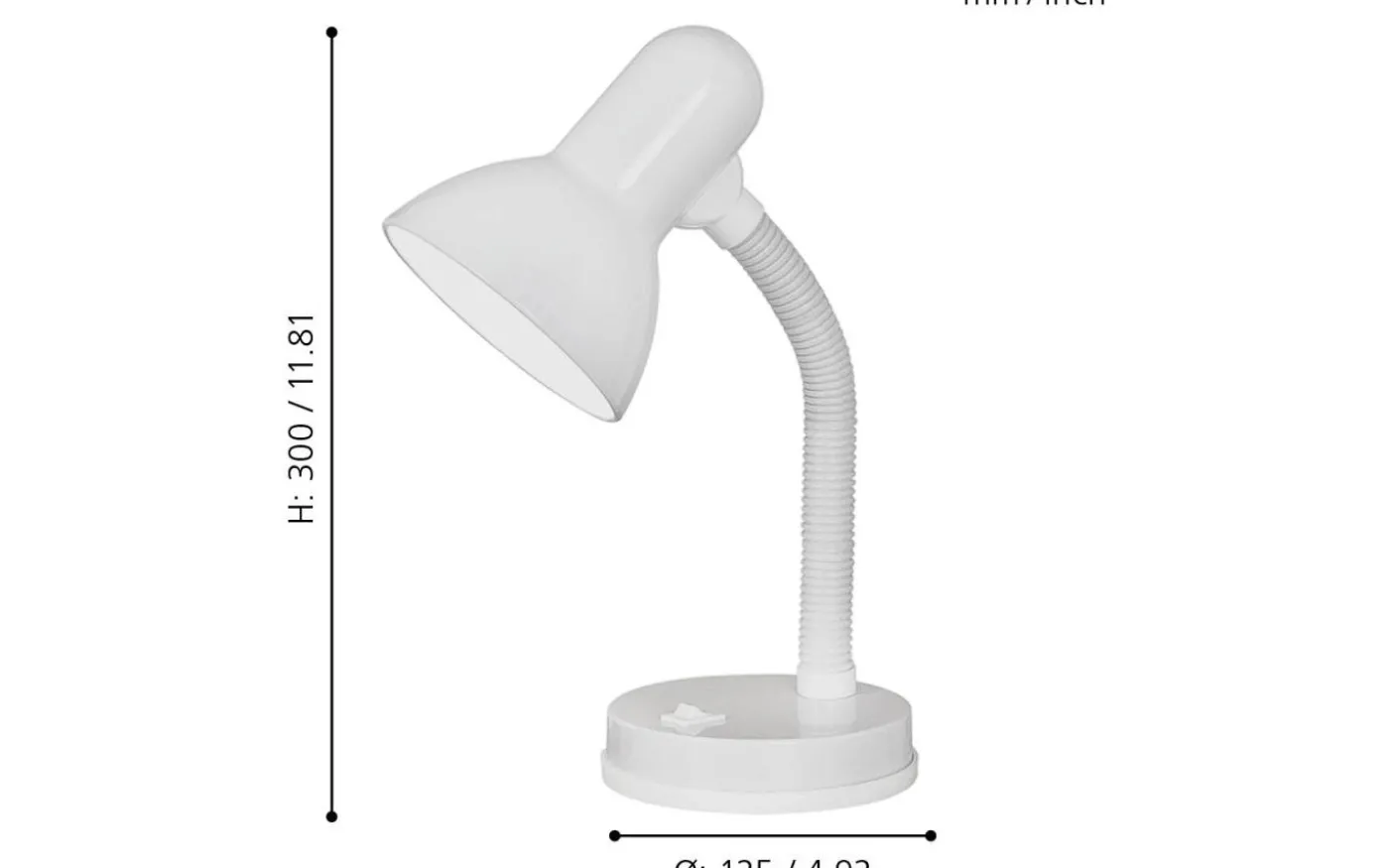 Bordslampan BASIC är gjord av vit metall och har en justerbar hals i vit plast. Tack vare den vita inre finishen på lampskärmen och den flexibla halsen ger produkten optimal, fokuserad belysning för din arbetsyta. Lampan kan enkelt tändas och släckas med hjälp av vippknappen på sockeln. Med sin klassiska design ger skrivbordslampan en praktisk belysningslösning för din arbetsyta, oavsett om det är på skrivbordet på ditt kontor eller ditt hemmakontor.