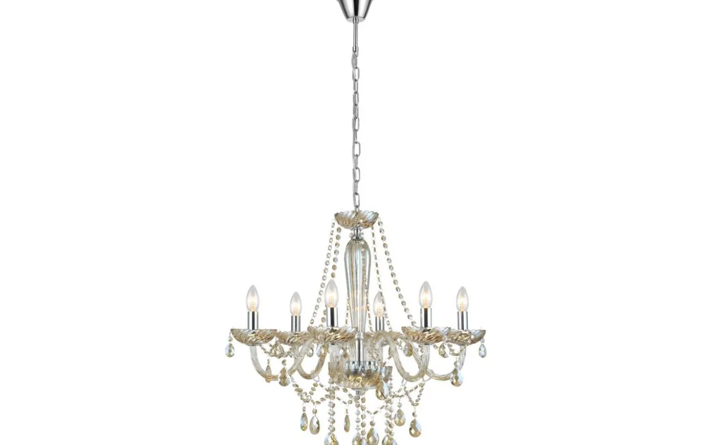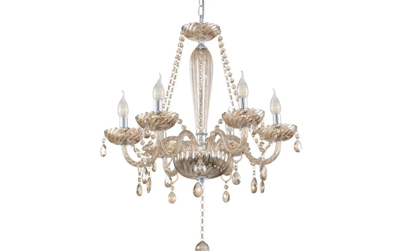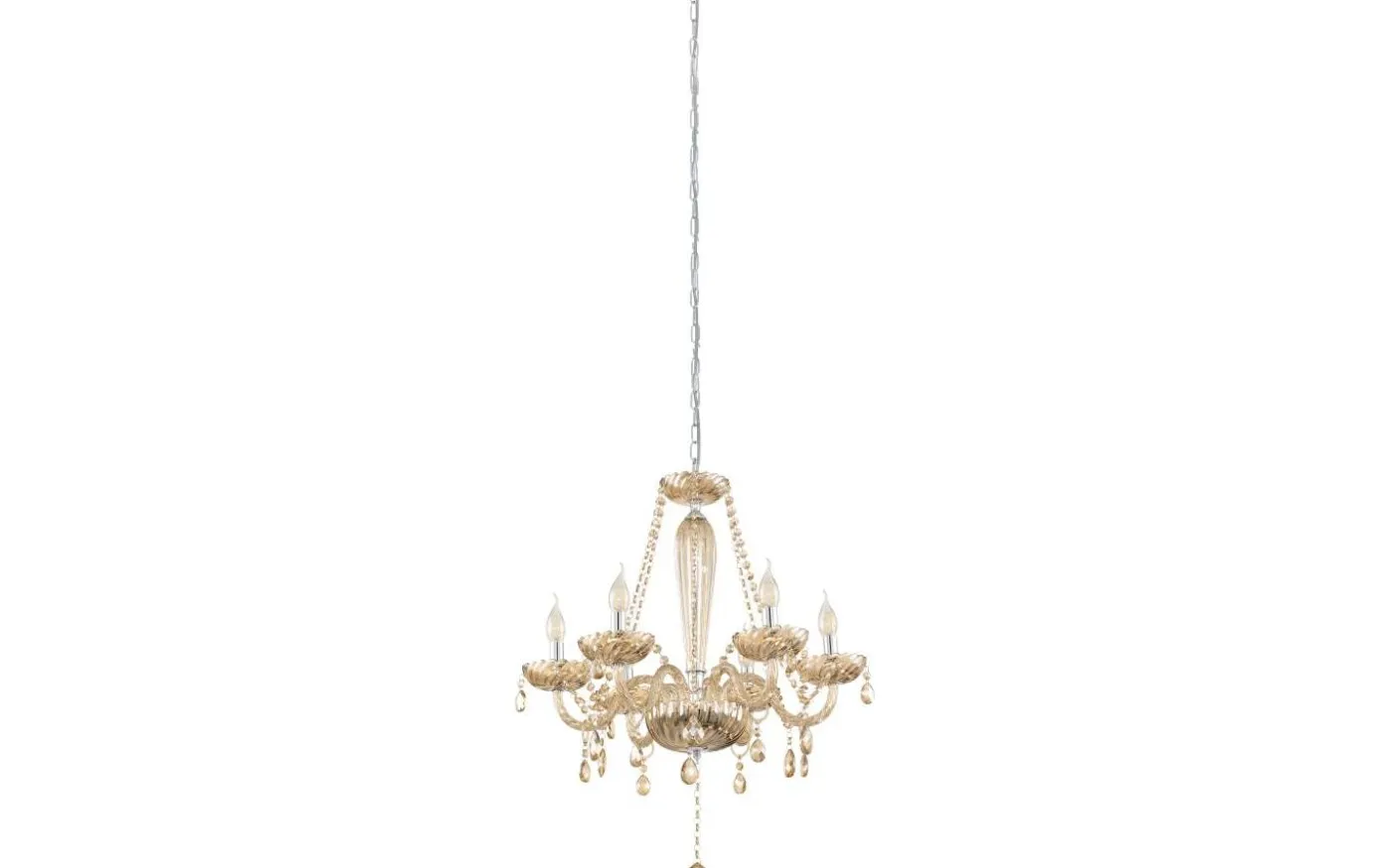 Denna pendelarmatur från serien BASILANO är gjord av förkromat stål och konjaksfärgat glas.