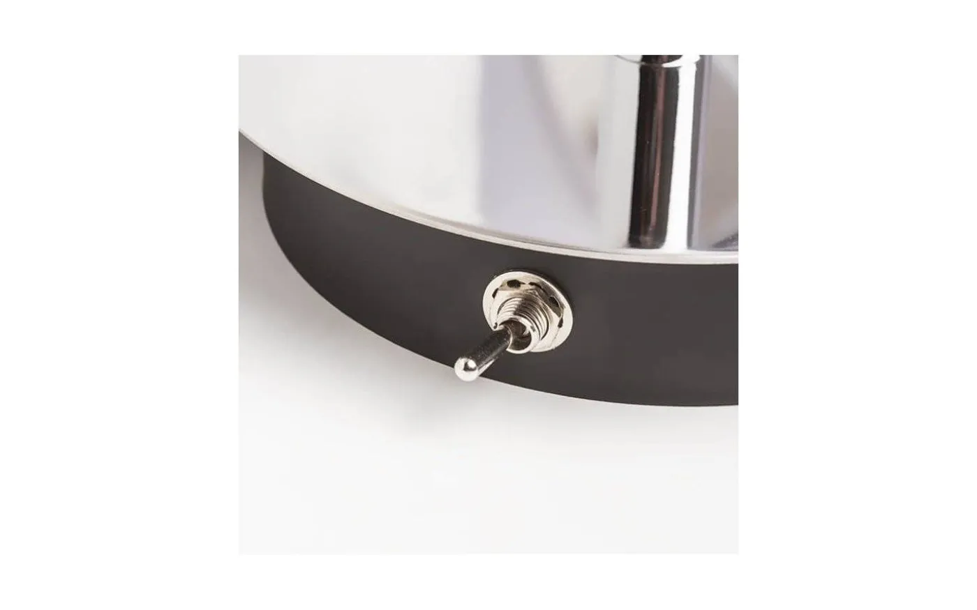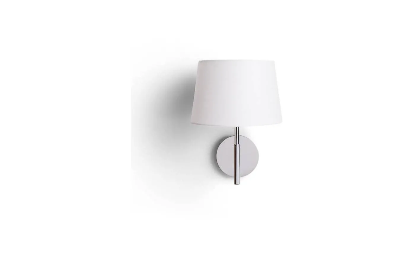 Funktionell vägglampa i krom med texturerad vit textilskärm.