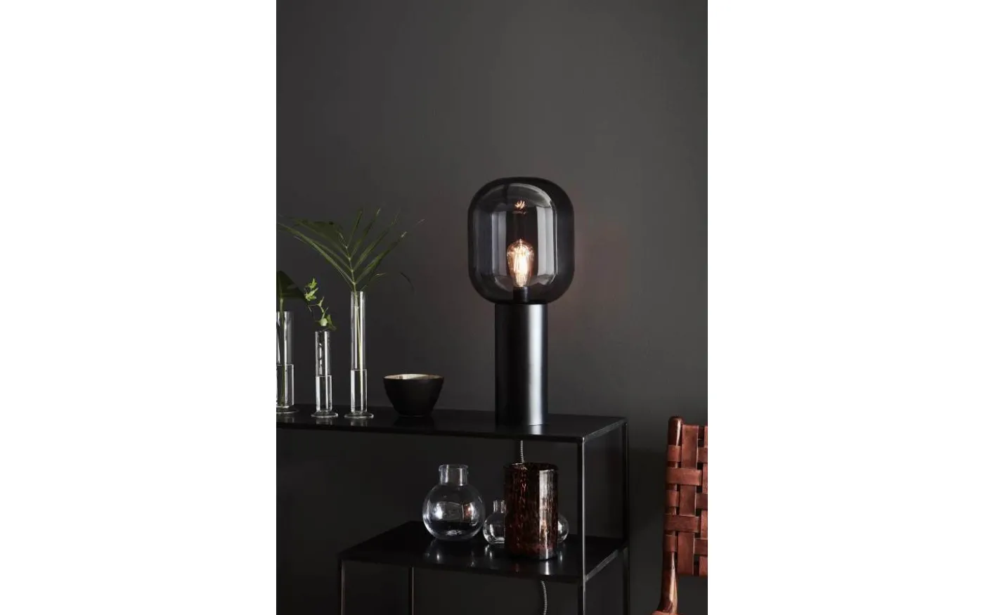 Härliga Brooklyn bordslampa, från välkända Markslöjd, är en elegant bordslampa med fot i svart metall och stor kupa i rökfärgat glas.