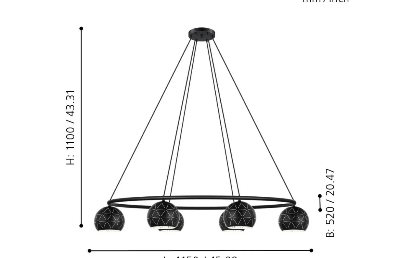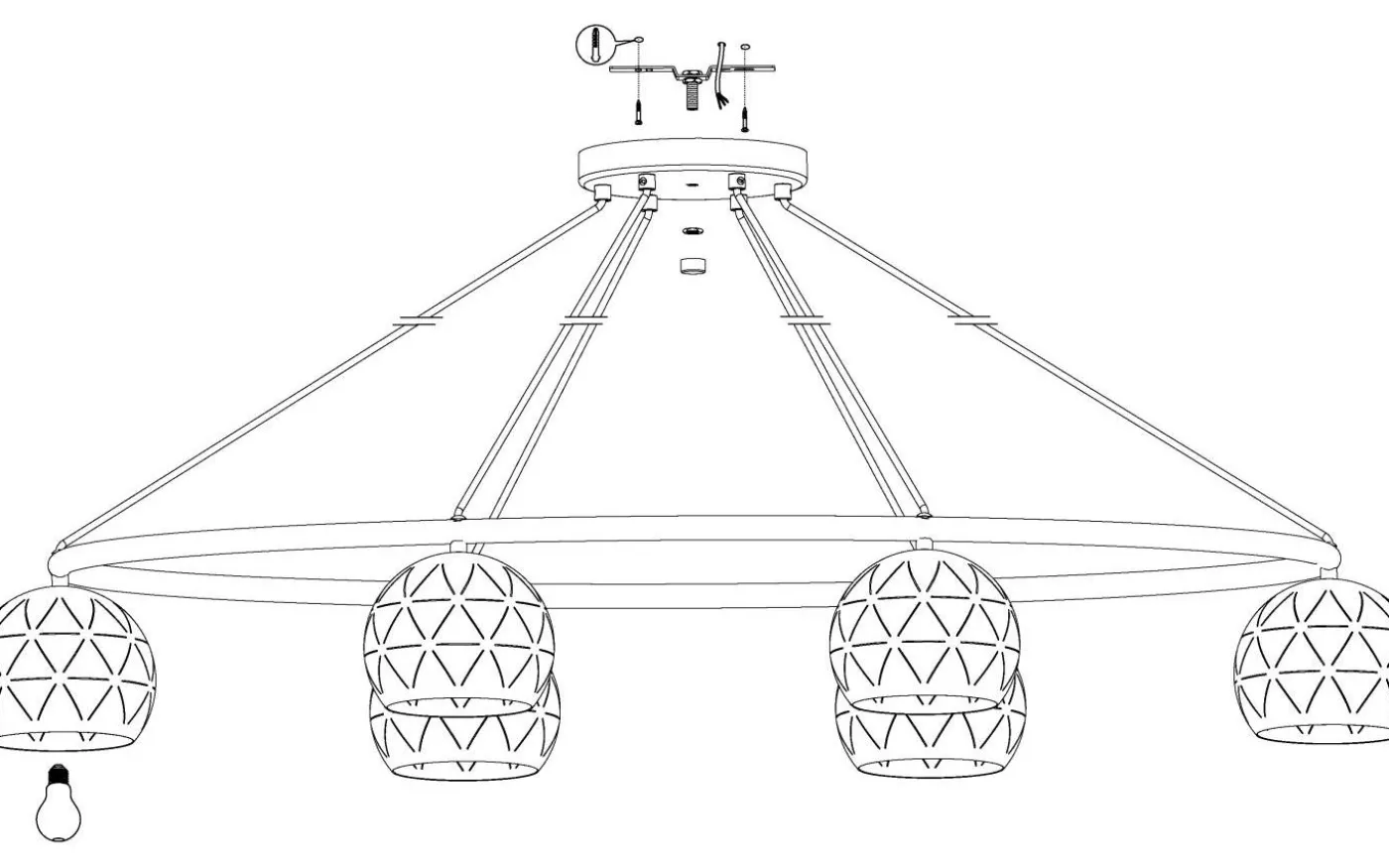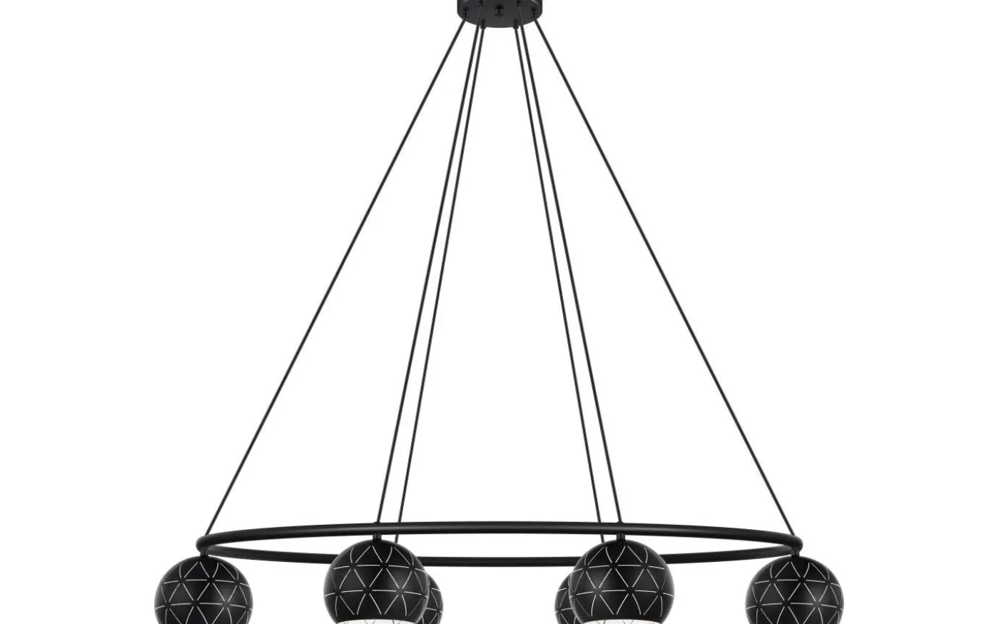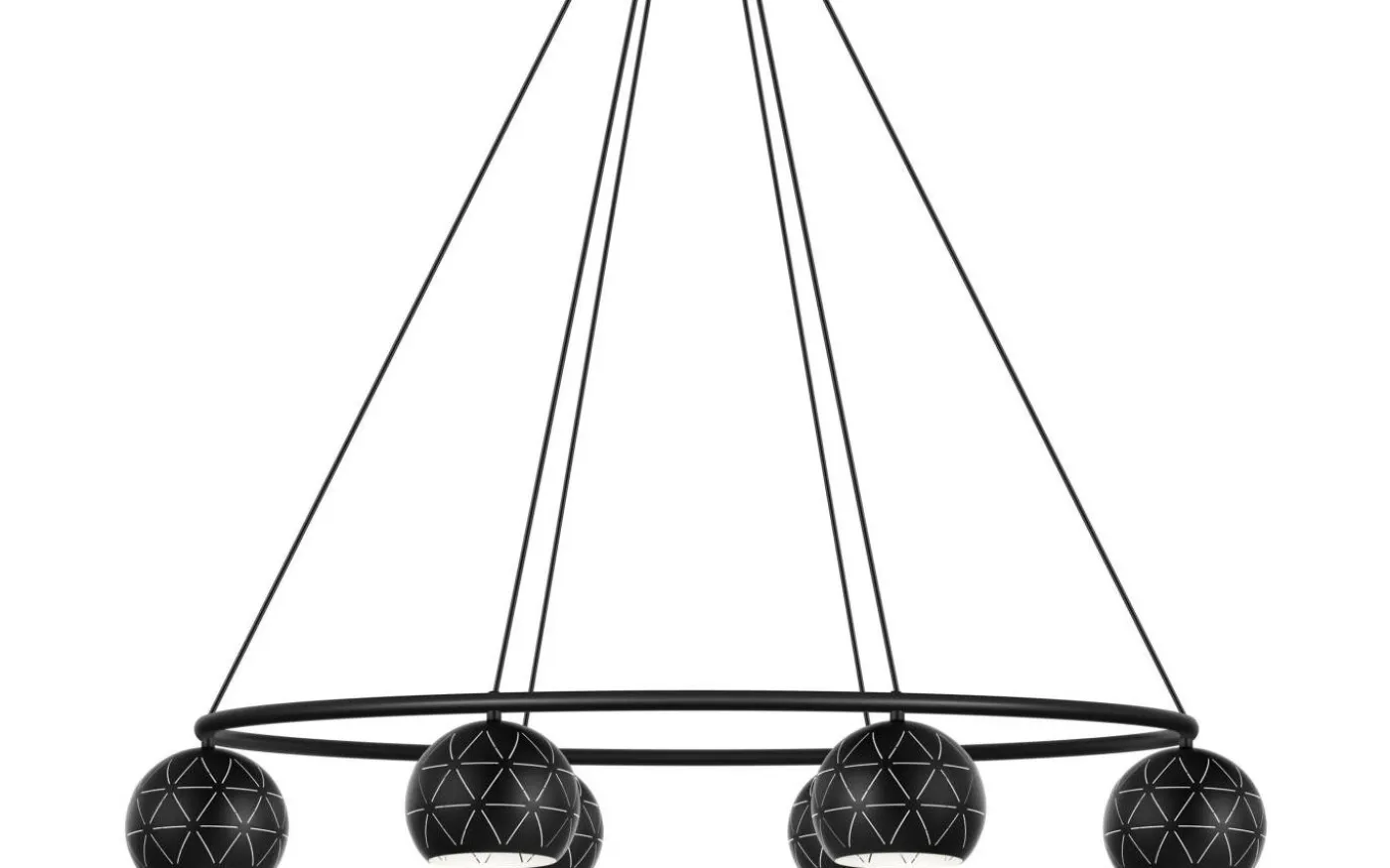 CANTALLOPS taklampa har en upphängd oval metallring i svart, med sex runda nyanser. De svarta metalllampskärmarna har ett utskuret mönster och en vit innerfinish. De geometriska öppningarna skapar ett fascinerande spel av ljus och skugga så fort ljuset tänds. Denna taklampa fungerar utmärkt med moderna inredningsstilar och skapar distinkt ljus i vardagsrummet eller ovanför bordet i matsalen.