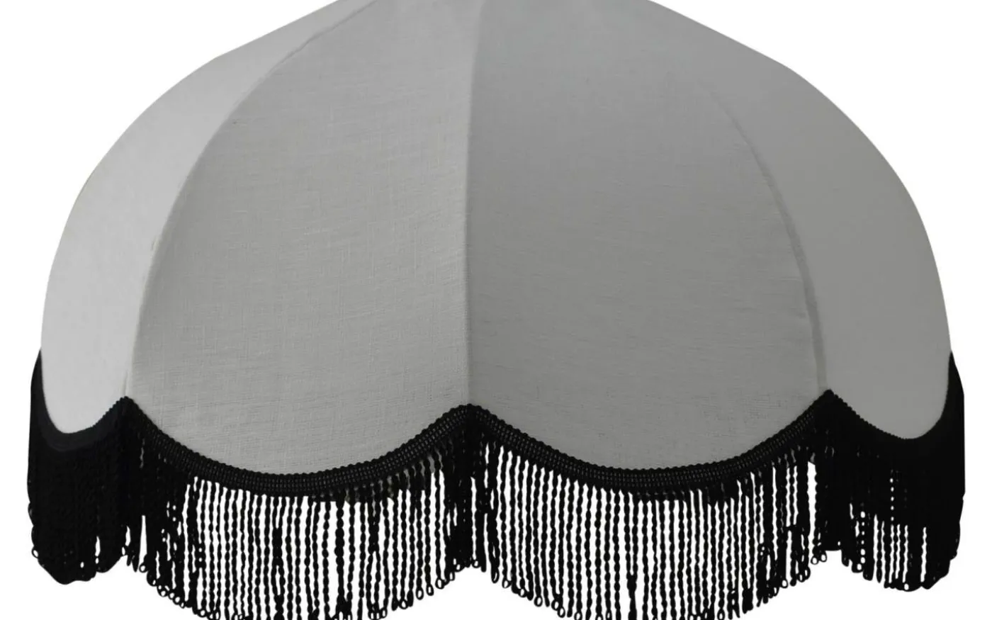 Carolin lampskärm från Hallbergs Belysning är en handsydd lampskärm av vitt linne tyg med en svart frans nertill.