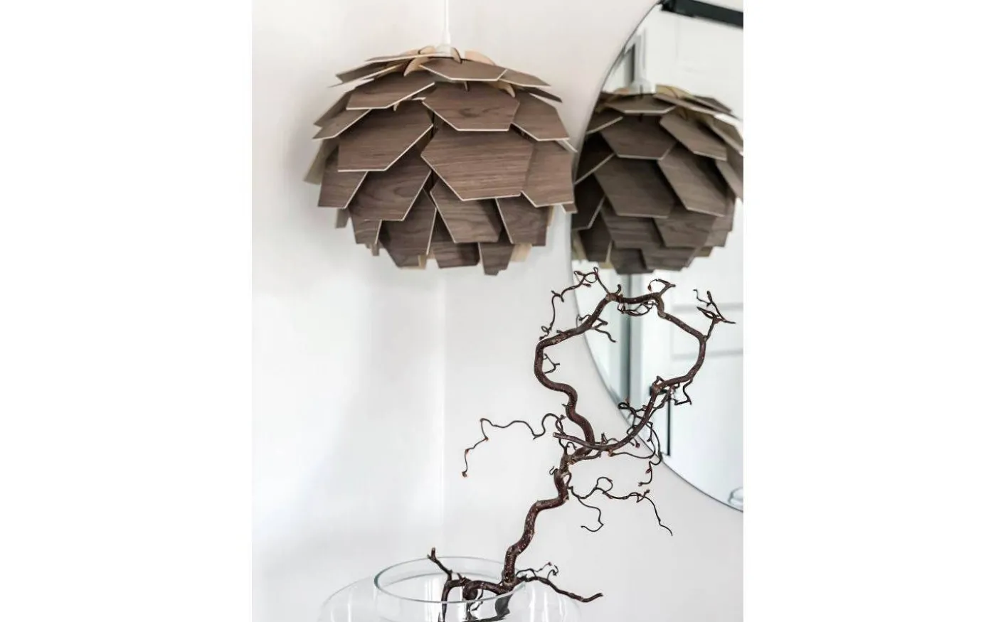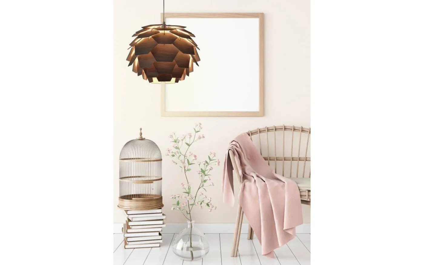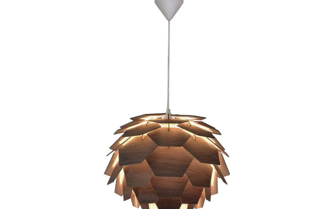Carpatica taklampa i valnötsbrun träfanér. Takkoppen är i vit plast för krokupphäng och med kopplingsplint. Max 60W E27, ingår ej. Snygg lampa med en klassisk och tidlös design. Storleken passar bra över såväl matbord som soffbord.
