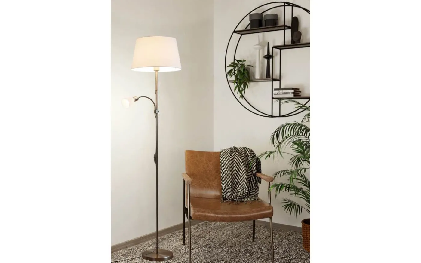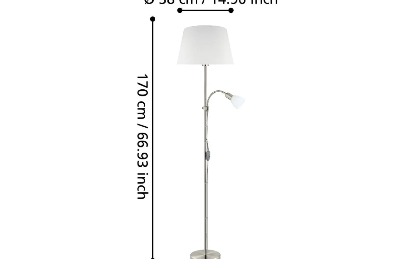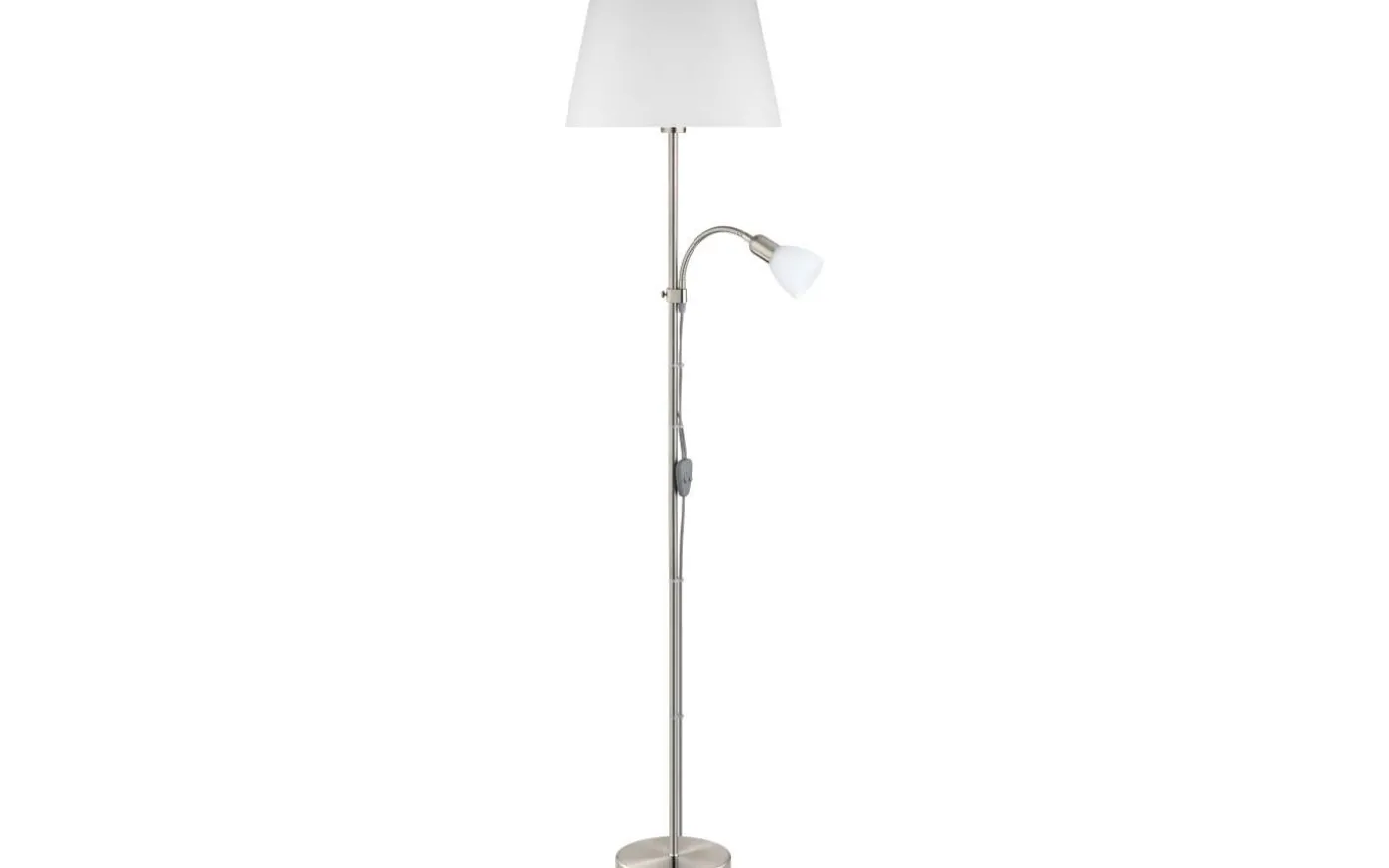 CONESA-golvlampan har en metallram i matt nickelfinish och en lampskärm av vit tyg. Det lilla ljuset på lampan har en glasskärm och satinplastkåpa och är flexibel, perfekt att använda som läslampa. Golvlampan kan enkelt tändas och släckas med de två sladdströmbrytarna. Oavsett om det är i sovrummet eller vardagsrummet ger produkten mysig belysning för ditt hem.