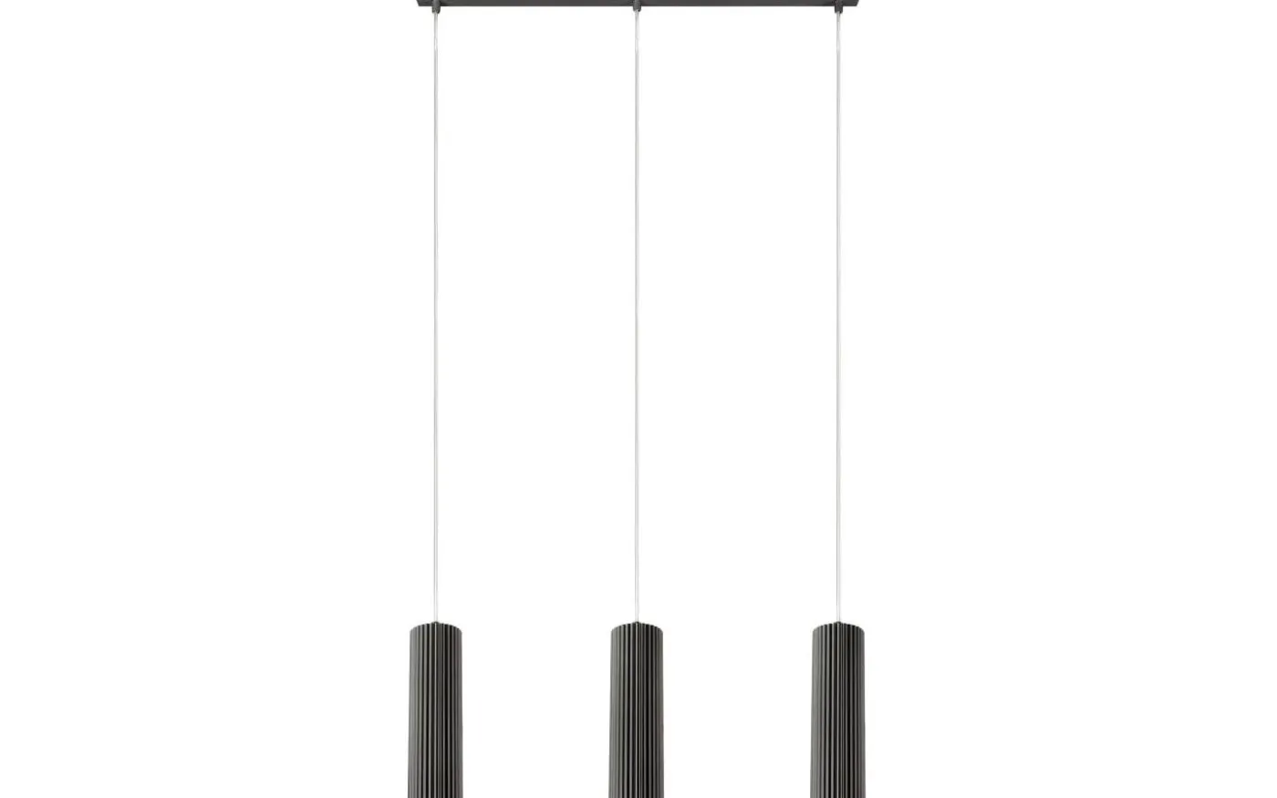 Takpendel i mörkgrå metall med tre spotlights. Diskret räfflade skärmar i metall som hänger på rad i transparenta kablar om 1,5 m. Taklampan ger ett behagligt allmänljus och har en enkel design som passar de flesta hem. Finns även i vitt och som serie med fler varianter.