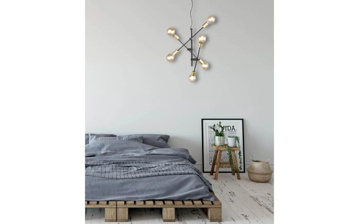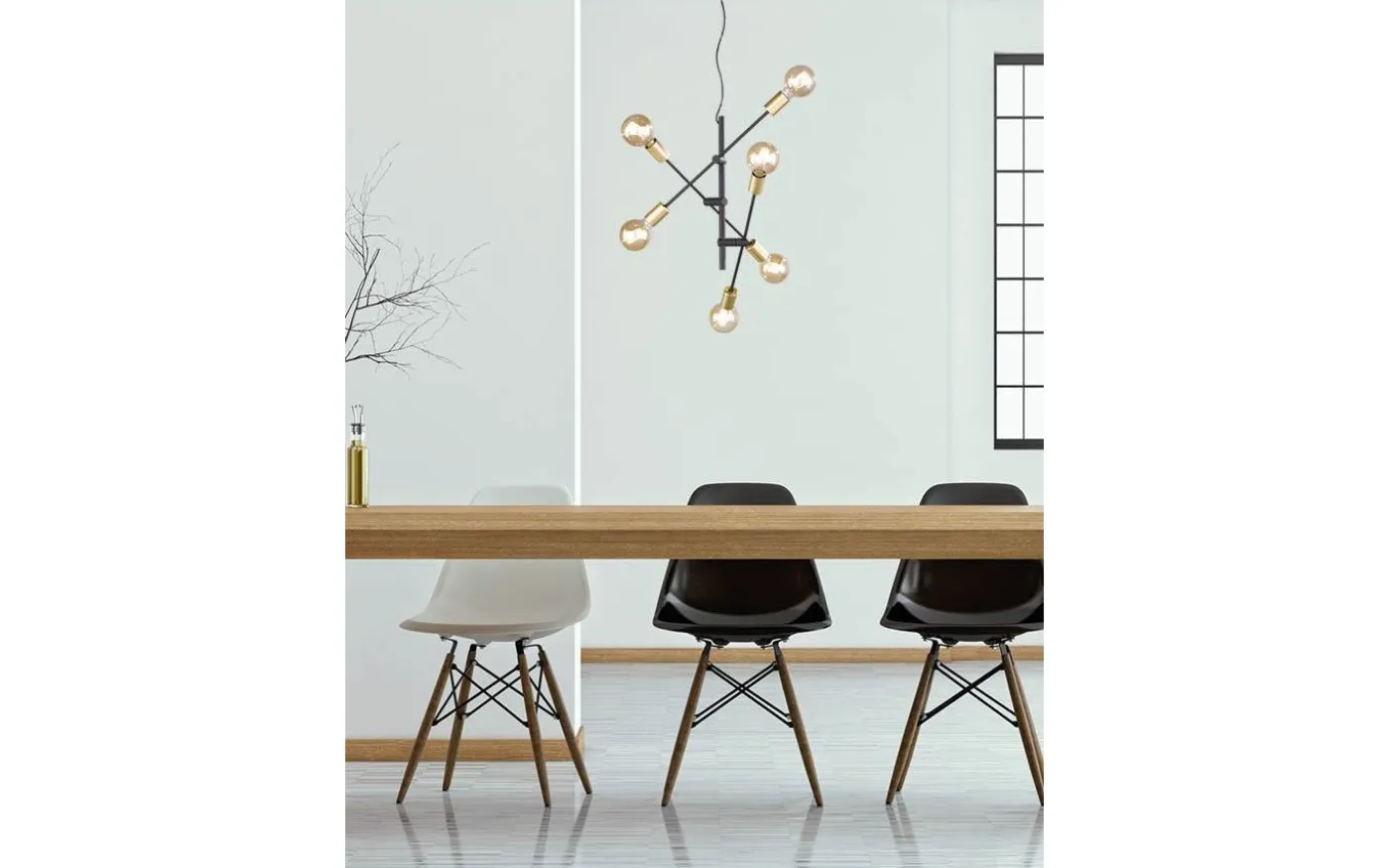 Okonventionell, kreativ och designinriktad. Minimalistiska armaturer som de i CROSS-serien sätter spännande accenter och sätter rätt ljus på rummen. Valet av färger och former skapar kontraster – smart kombinerade skapar de en mysig och elegant atmosfär. Armaturen är ett smakfullt tillskott till nästan alla interiörer och kan med en individuell upphängningslängd på max 150 cm och en diameter på 55 cm placeras idealiskt ovanför matbordet eller i entrén. För ett harmoniskt utseende rekommenderar vi att använda en glödtrådsljuskälla, eftersom du har direkt utsikt över ljuskällan. Den enkla, raka metallramen i mattsvart med bronsfärgade lamphållare skapar ett harmoniskt helhetsintryck. För modern och pålitlig belysning rekommenderas att använda en LED-lampa. Den erbjuder hög ljuskvalitet, är mångsidig och övertygar med jämn belysning. Dess långa livslängd och låga värmeutveckling gör den till det perfekta valet för en mängd olika användningsområden. Ljuskälla: exklusiv 6x E27 · max. 28W. Extra information: Justerbar i höjd, Takmontering, IP20, Lampa(or) ingår ej, Svängbar