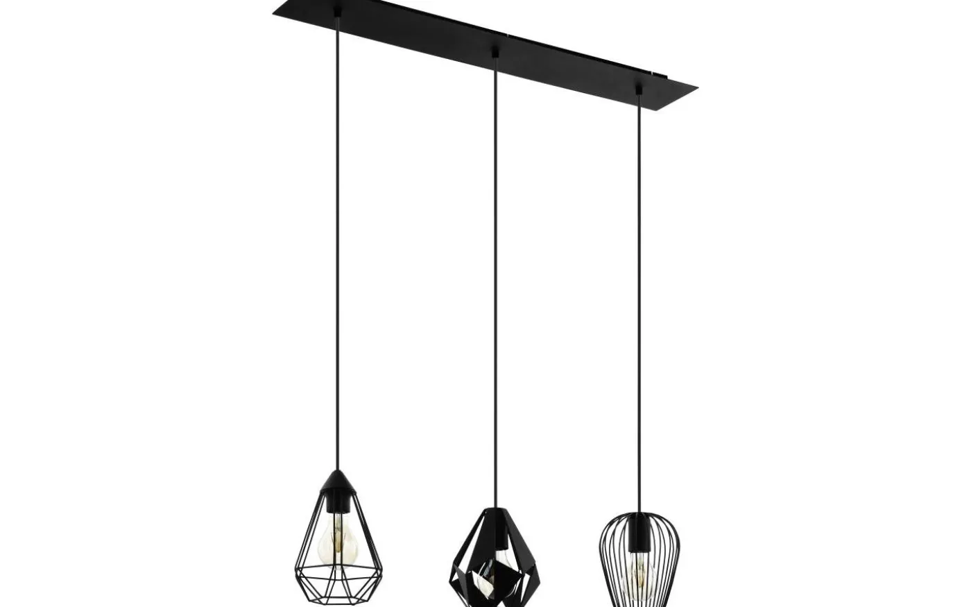 DISTAFF taklampa har tre svarta metallskärmar i olika geometriska mönster. Skärmarna är upphängda från den rektangulära svarta metallkapellet. Den utskurna designen på lampskärmarna skapar ett fascinerande spel av ljus och skugga på väggen. Pendellampan kompletterar moderna interiörer och fungerar bra i alla utrymmen, oavsett om det är i vardagsrummet eller över ett långbord i matsalen.