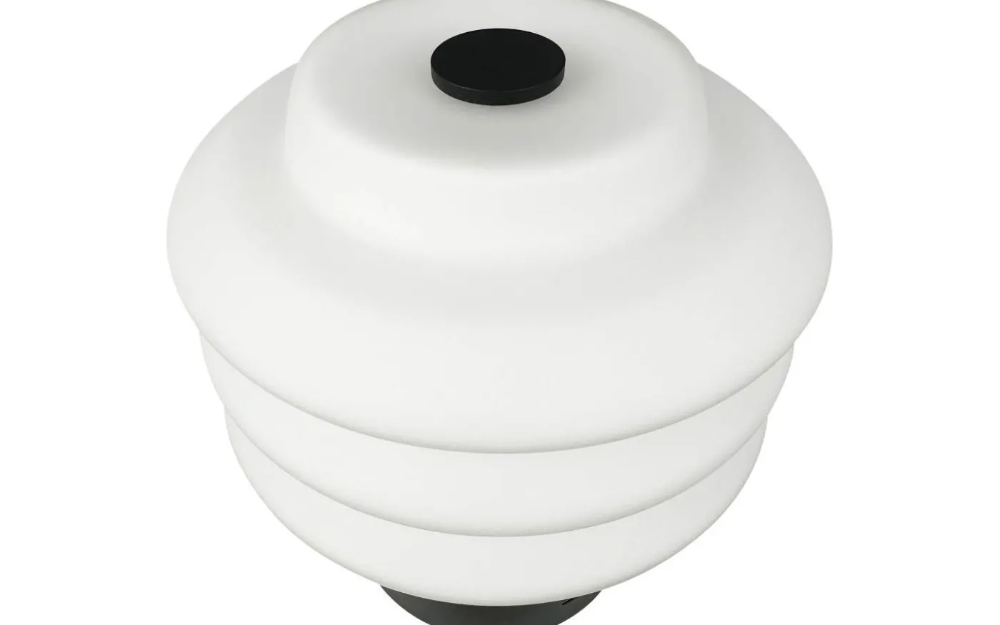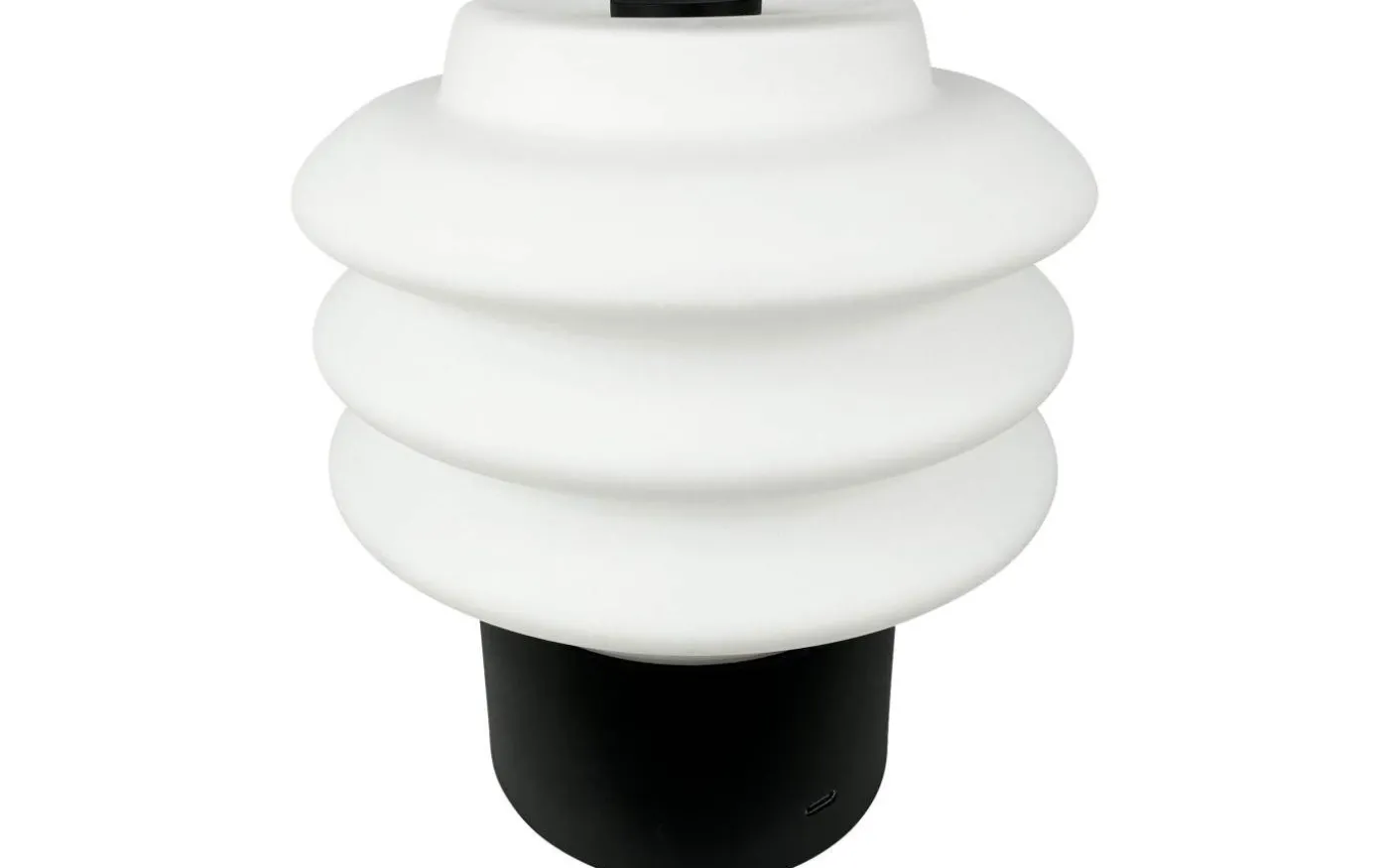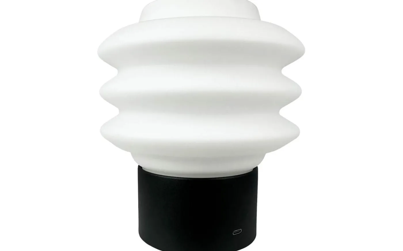 Laddningsbar bordslampa med opalglas i vit, svart fot. USB-C laddning.
