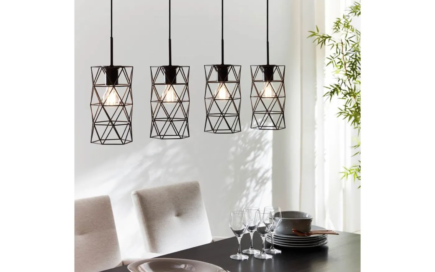 ESTEVAU taklampa har fyra mörkbruna trådskärmar och ett avlångt takfäste i samma färg. När ljuset är på skapar det ett fascinerande spel av ljus och skugga genom de geometriska nyanserna. Denna moderna taklampa ger stilfull belysning i vardagsrummet eller över ett långbord i matsalen.