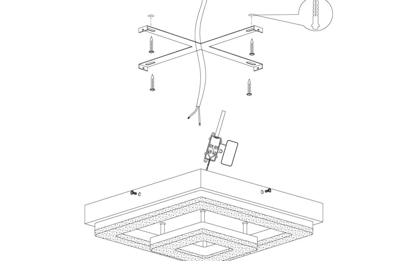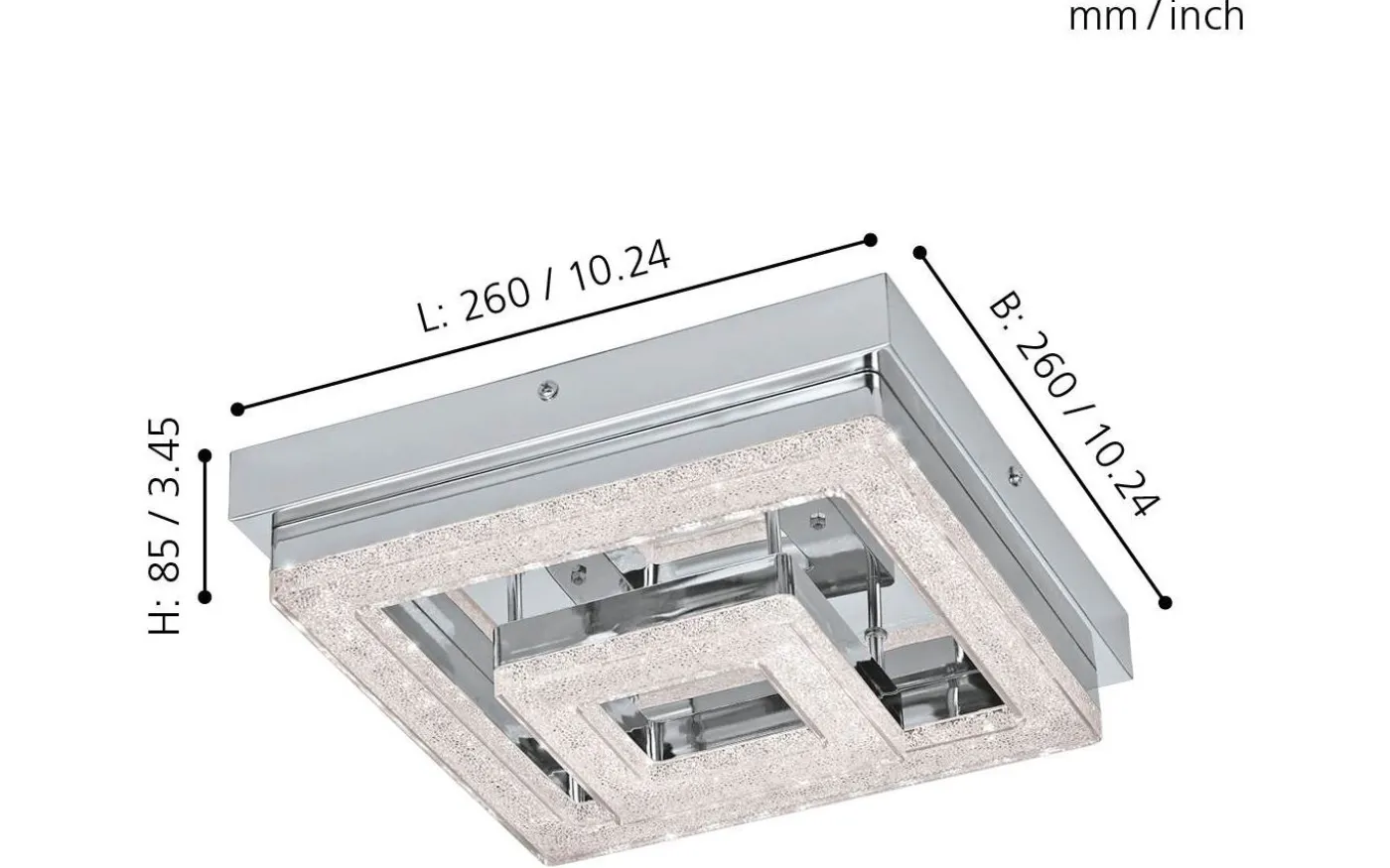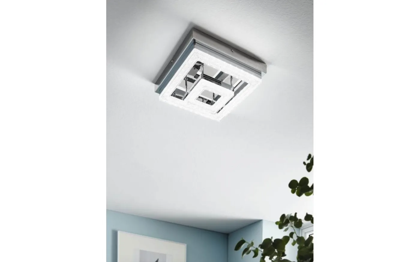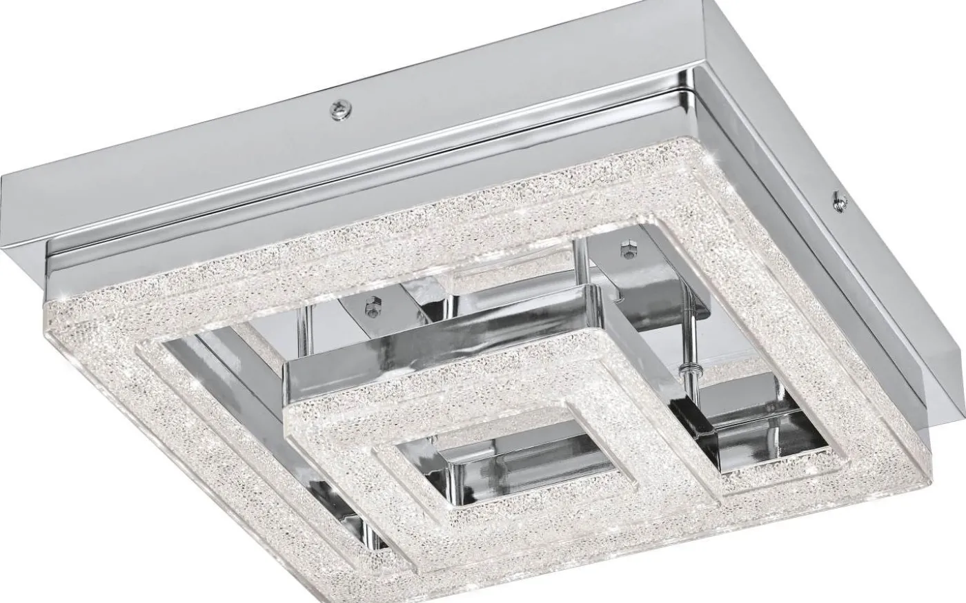 FRADELO LED-taklampa har en fyrkantig kromfärgad metallkropp och två transparenta plastljuselement i olika storlekar med klara granulära kristaller inuti. Dessa kristaller skapar ett gnistrande, exklusivt utseende, medan de integrerade lysdioderna ger ett behagligt varmvitt ljus. Med sin klassiska design smälter produkten sömlöst in i moderna interiörer och fungerar bra i alla vardagsrum, oavsett om det är i köket, vardagsrummet, sovrummet eller hallen.