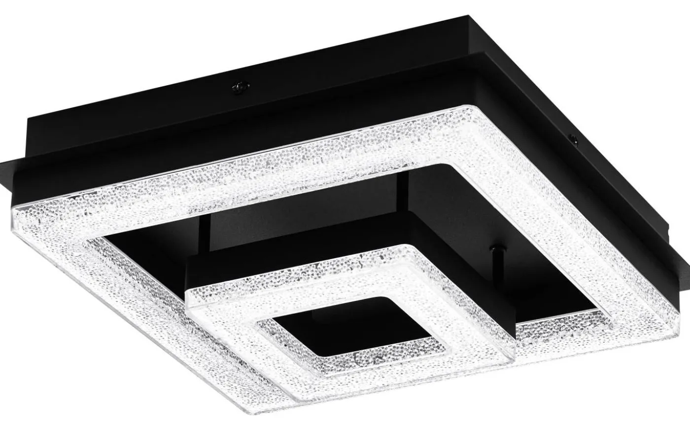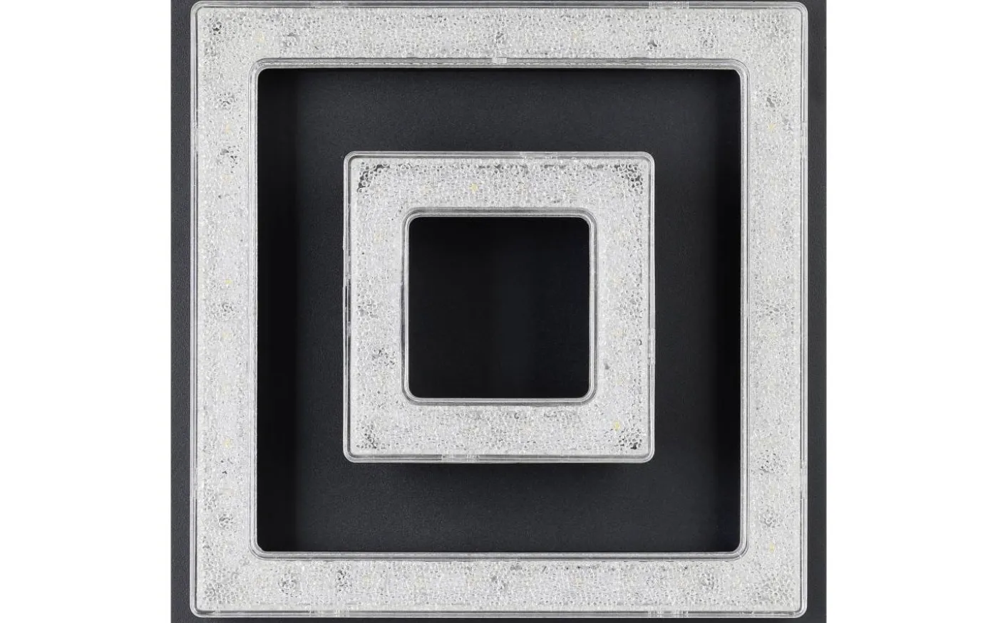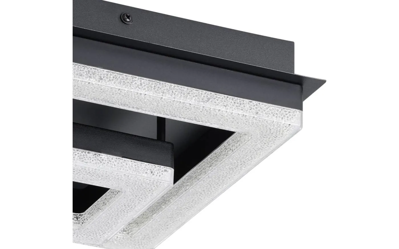 FRADELO 1 LED-taklampa har en fyrkantig svart metallkropp och två transparenta plastljuselement i olika storlekar med klara granulära kristaller inuti. Denna kristalldesign skapar en glittrande, exklusiv look, som står i kontrast till den svarta finishen för en dramatisk effekt. De integrerade lysdioderna ger ett behagligt varmvitt ljus. Med sin klassiska design smälter produkten sömlöst in i moderna interiörer och fungerar bra i alla vardagsrum, oavsett om det är i kök, vardagsrum, sovrum, hall eller matsal.