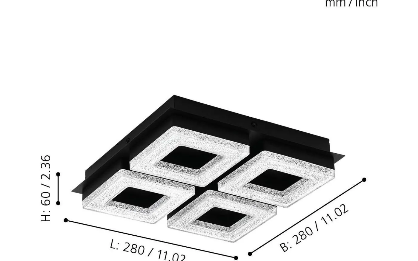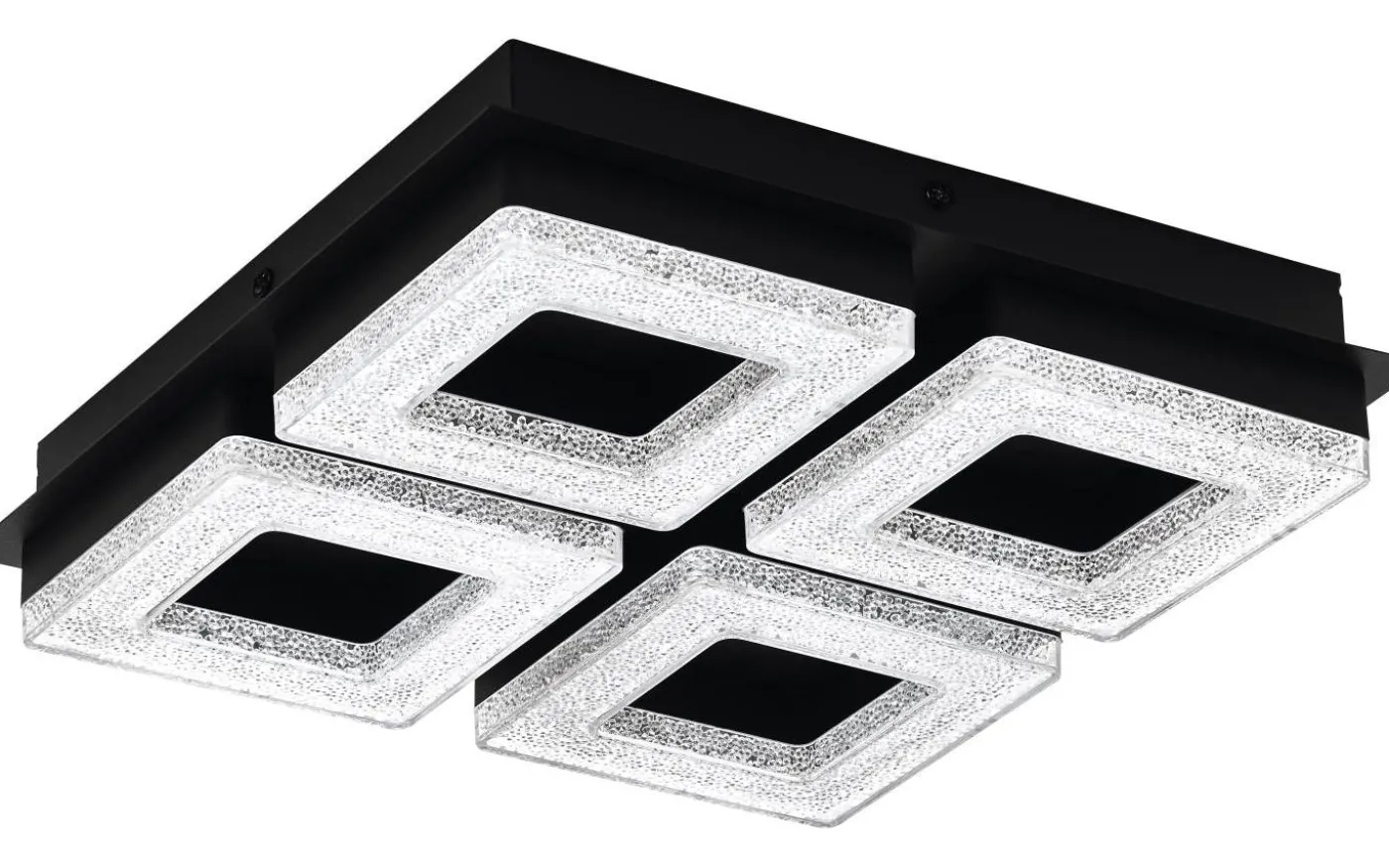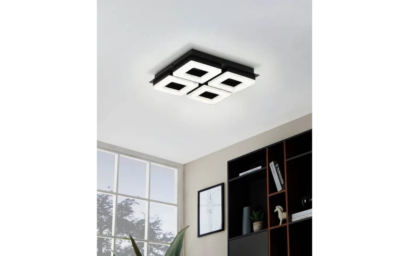 FRADELO 1 LED-taklampa har en fyrkantig svart metallkropp och fyra transparenta plastljuselement med klara granulära kristaller inuti. Denna kristalldesign skapar en glittrande, exklusiv look, som står i kontrast till den svarta finishen för en dramatisk effekt. De integrerade lysdioderna ger ett behagligt varmvitt ljus. Med sin klassiska design smälter produkten sömlöst in i moderna interiörer och fungerar bra i alla vardagsrum, oavsett om det är i kök, vardagsrum, sovrum, hall eller matsal.