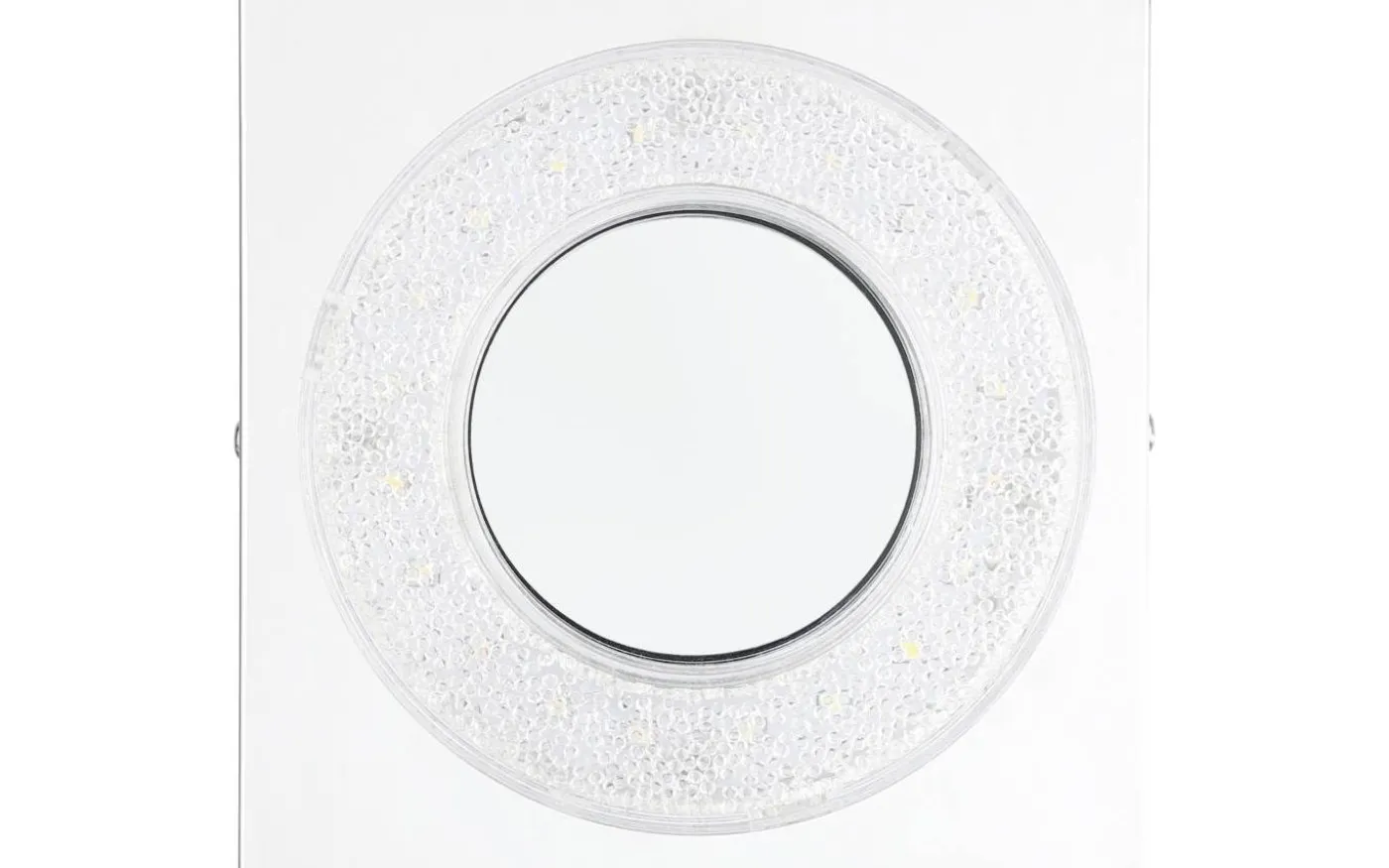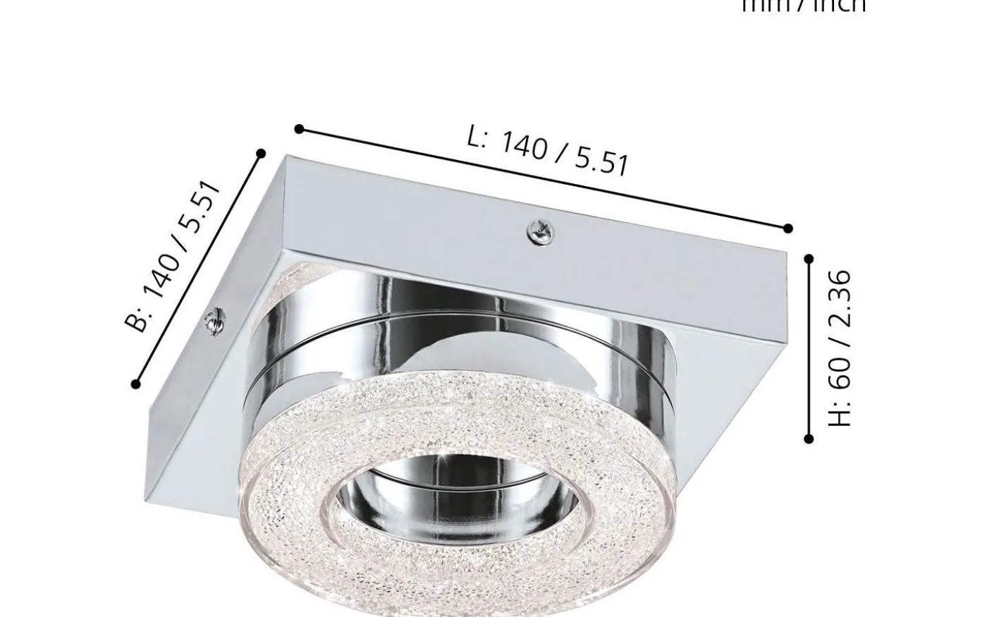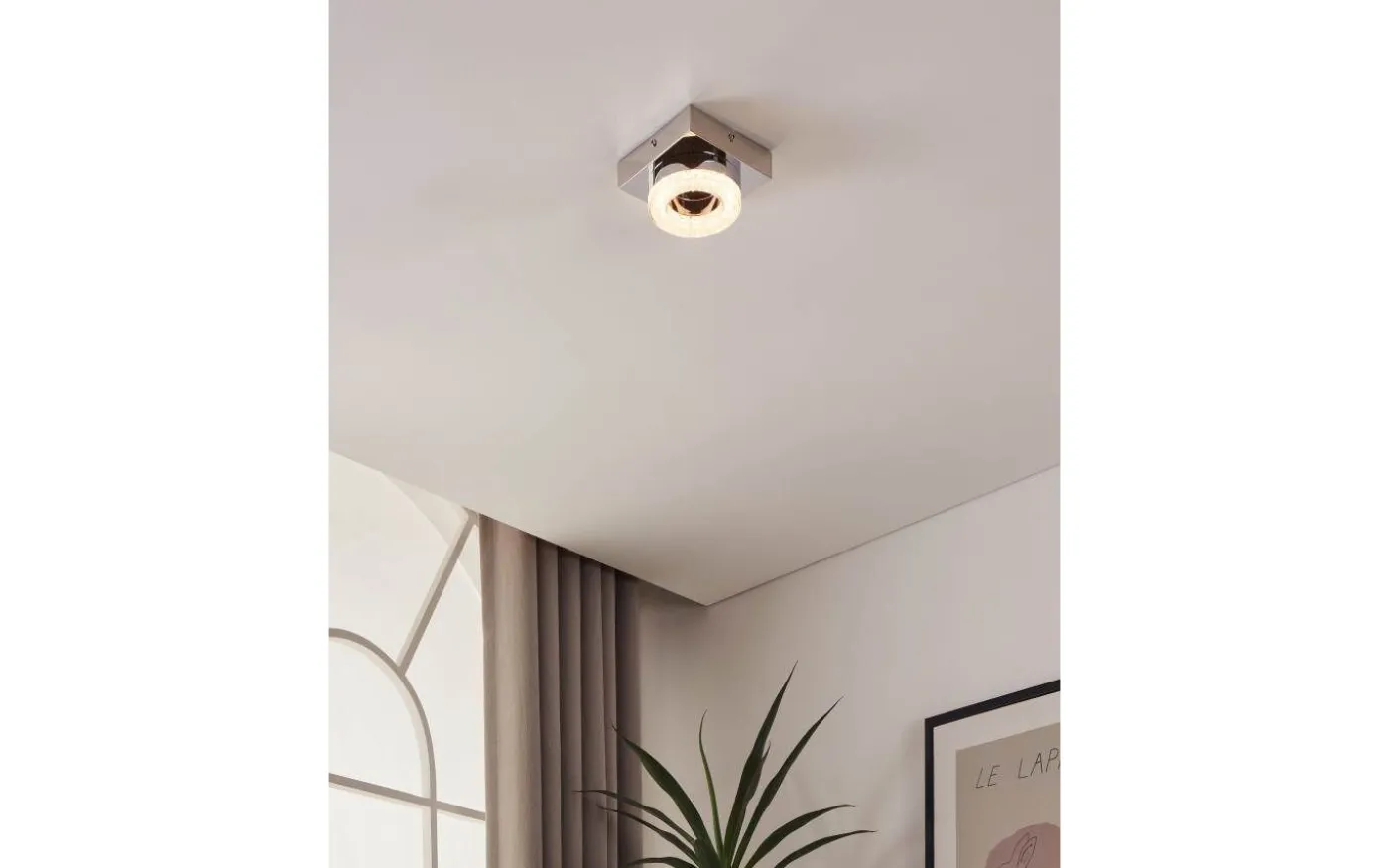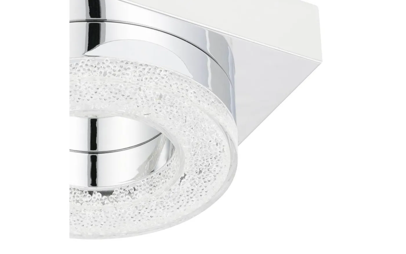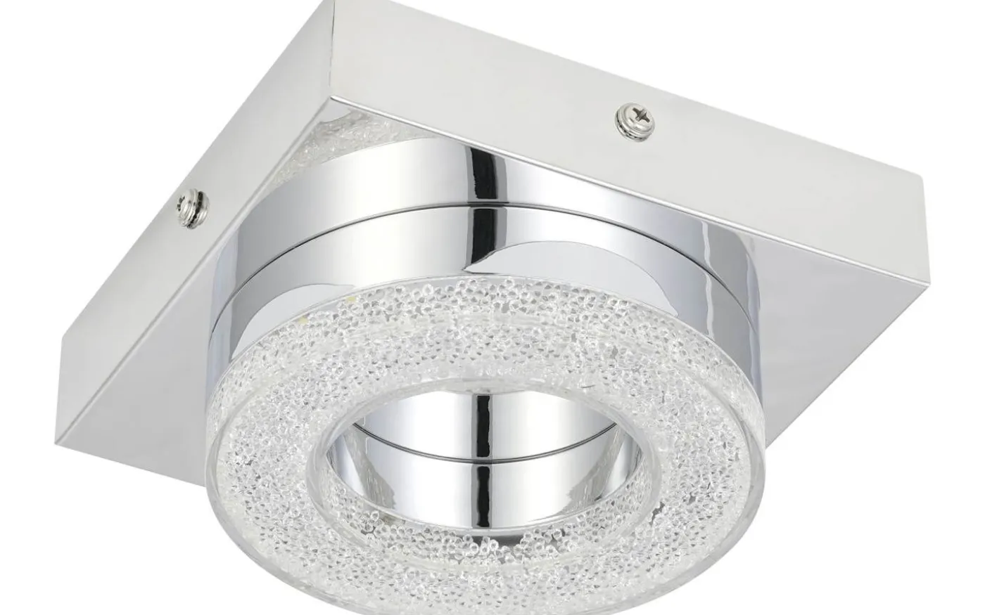 FRADELO LED-taklampa har en fyrkantig kromfärgad metallkropp och ett runt transparent plastljuselement med klara granulära kristaller inuti. Dessa kristaller skapar ett gnistrande, exklusivt utseende, medan de integrerade lysdioderna ger ett behagligt varmvitt ljus. Med sin stilrena design smälter produkten sömlöst in i moderna interiörer och fungerar bra i alla vardagsrum, oavsett om det är i köket, vardagsrummet, sovrummet eller hallen.