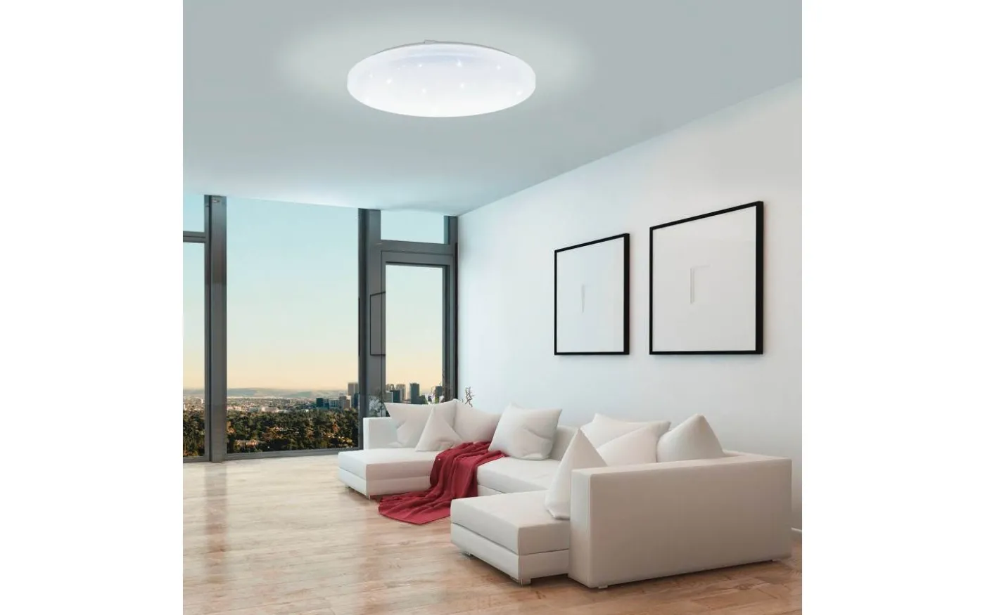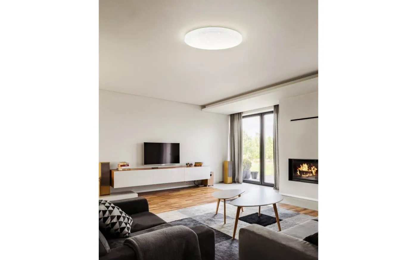 FRANIA-A LED-taklampan från den fjärrstyrda Access-serien har en rund vit plastkåpa och en vit metallfot. När ljuset är på skapar det en gnistrande effekt som stjärnor på natthimlen. De integrerade lysdioderna ger ett behagligt ljus som kan justeras efter behov. Du kan välja mellan varmvitt, neutralvitt och kallvitt ljus. Ljuset kan styras med hjälp av den medföljande fjärrkontrollen, som även erbjuder andra funktioner som justering av ljusstyrkan, en nattlampa och en timer (som släcks efter 30 minuter), plus två förinställda belysningslägen. Du kan också använda fjärrkontrollen för att styra upp till åtta Access-lampor samtidigt och spara anpassade ljusinställningar. Produkten är lämplig för användning i badrummet på grund av dess IP44-skydd mot sprutvatten. Med en diameter på 30 cm smälter taklampan sömlöst med moderna och minimalistiska interiörer och ger stilfull belysning för alla utrymmen, oavsett om det är i badrummet, köket eller hallen.