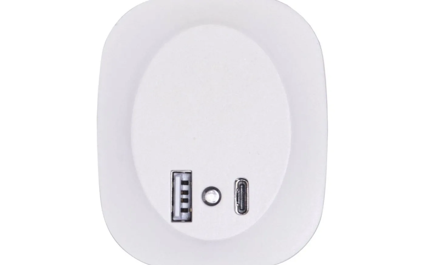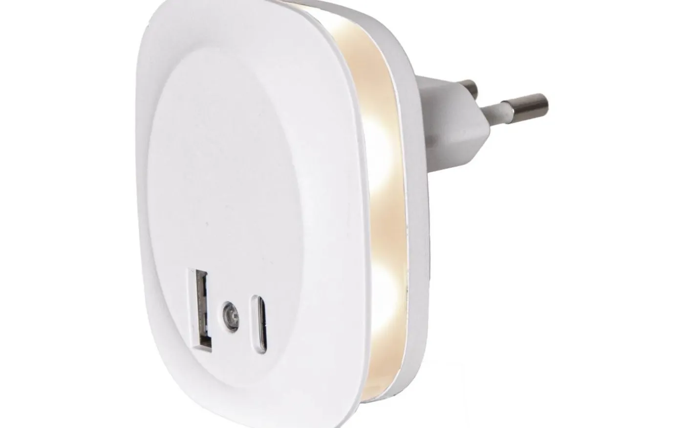 En smidig nattlampa med inbyggd skymningssensor och dubbla USB-uttag (A och C, 5V/1A).