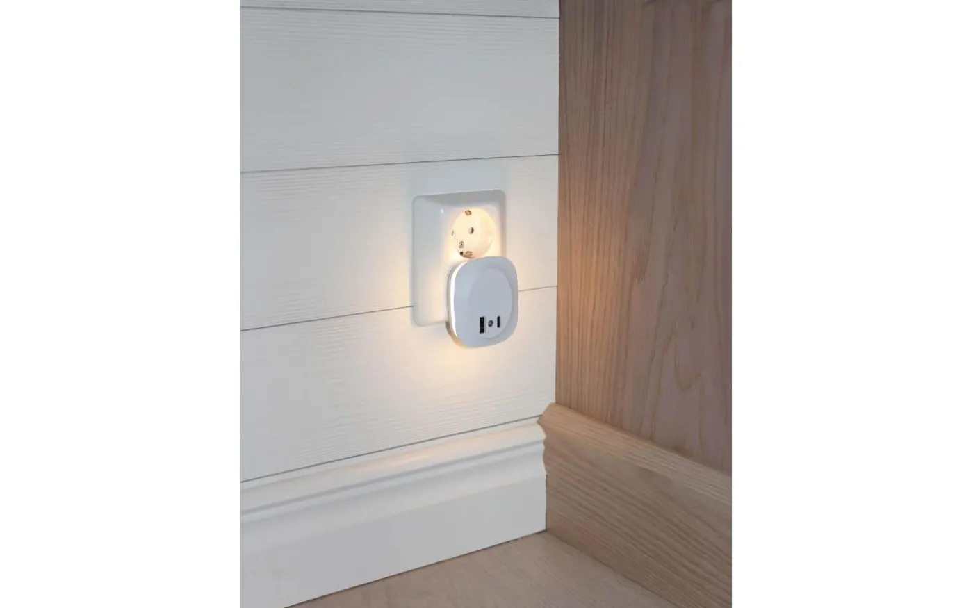 Lampan tänds automatiskt när ljusnivån i rummet understiger 30 lux och sprider ett mjukt sken runtom sidorna under kväll och natt. Plugga bara in den i ett vägguttag för både belysning och praktisk laddning av dina enheter.