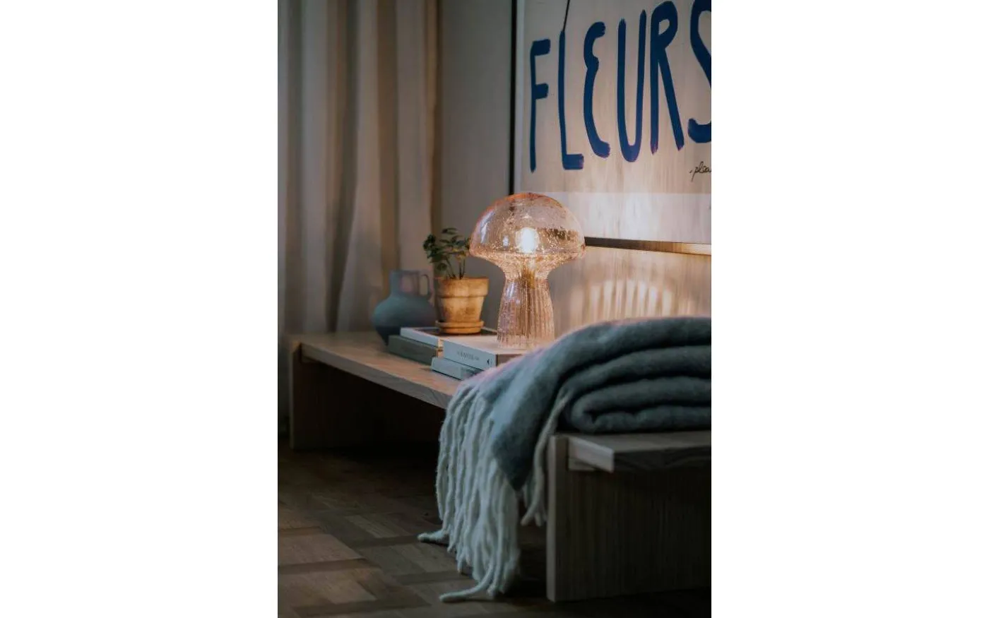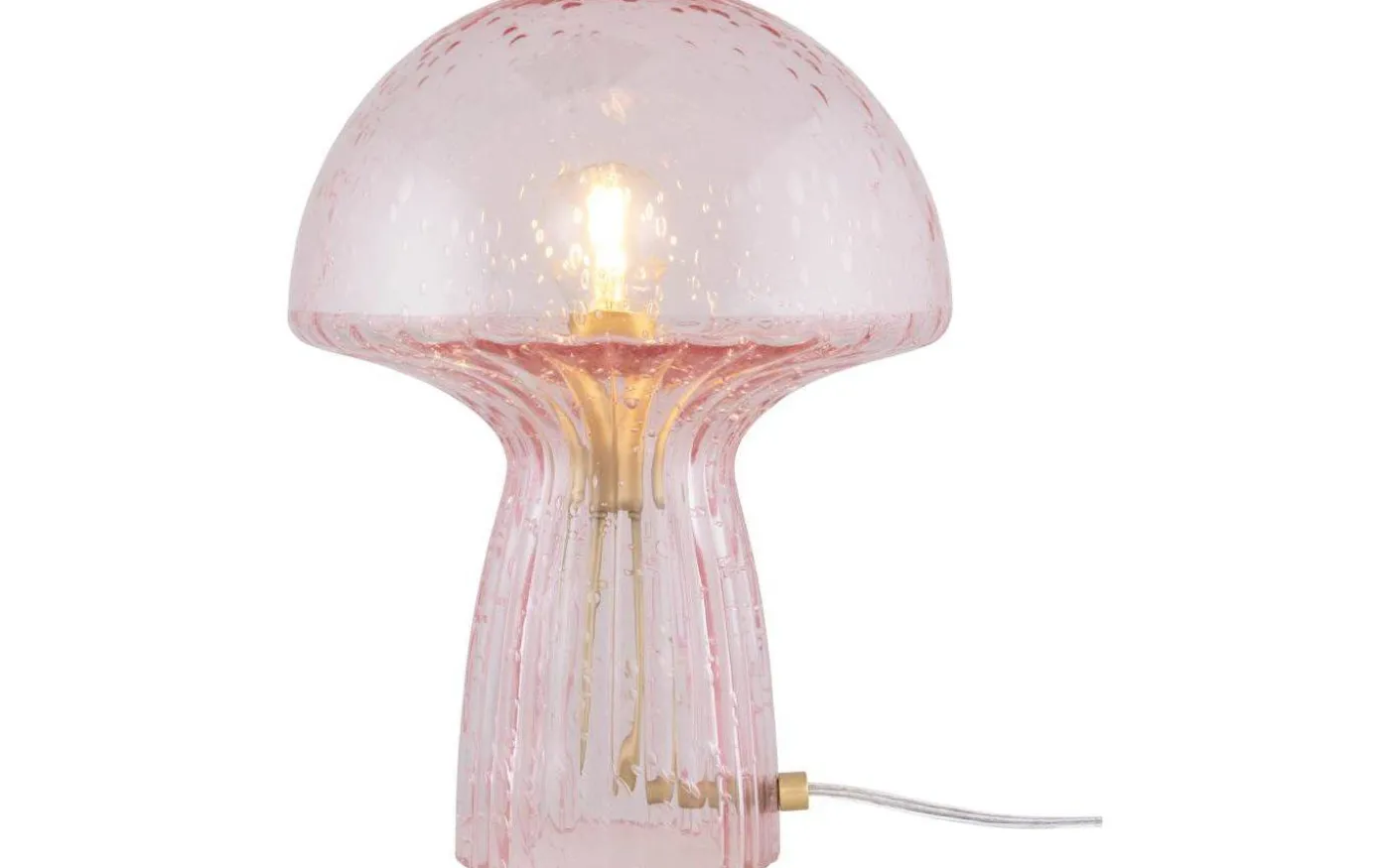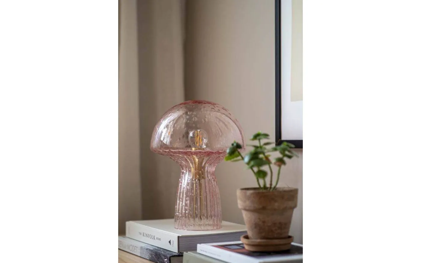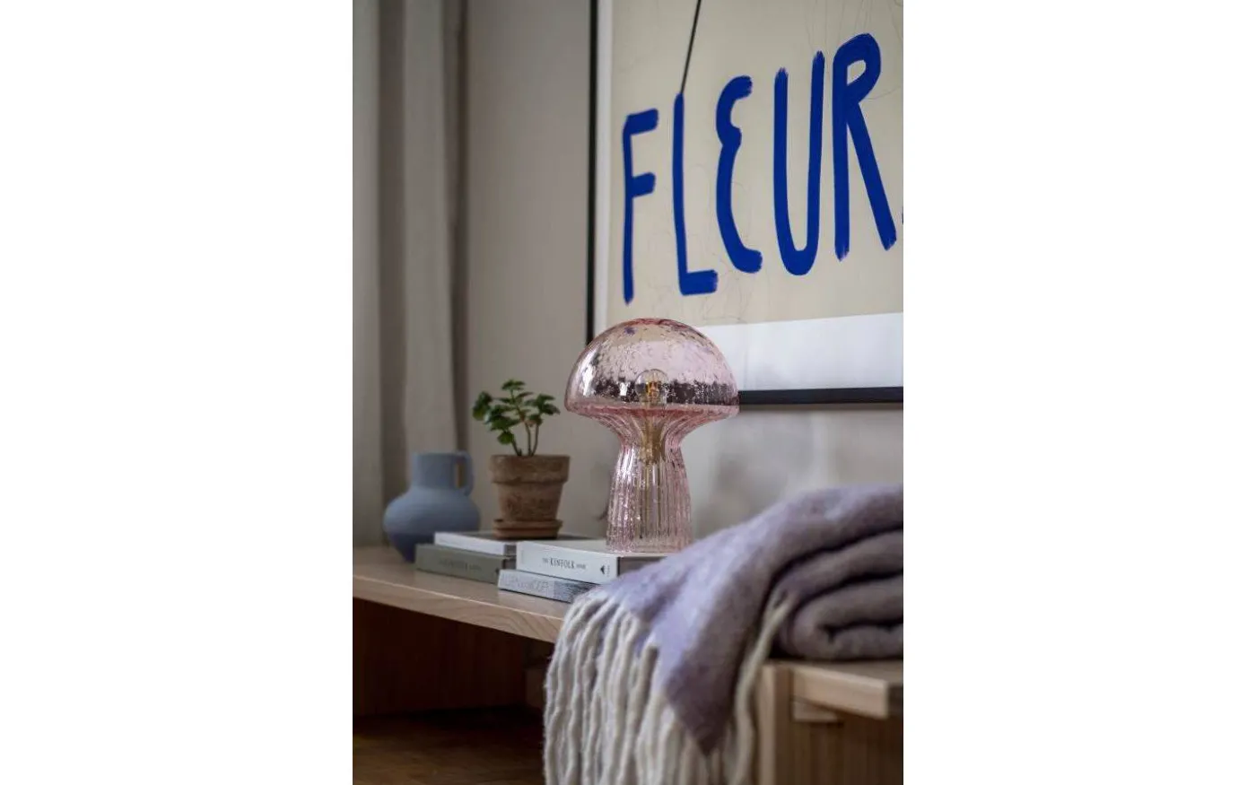 Fungo bordslampa från Globen Lighting är designad av GL Design Studio som med inspiration från skogen skapat denna nätta bordslampa avbildad som en svamp. Bordslampan är gjord av rosafärgat glas med räfflade detaljer på foten där räfflorna går hela vägen upp under hatten likt lamellerna på en skivling svamp. Bordslampan har en lamphållare i kontrasterande borstad mässingsfärgad metall och på glaset är där små vackra luftbubblor som ger en fin karaktär när lampan är tänd.
