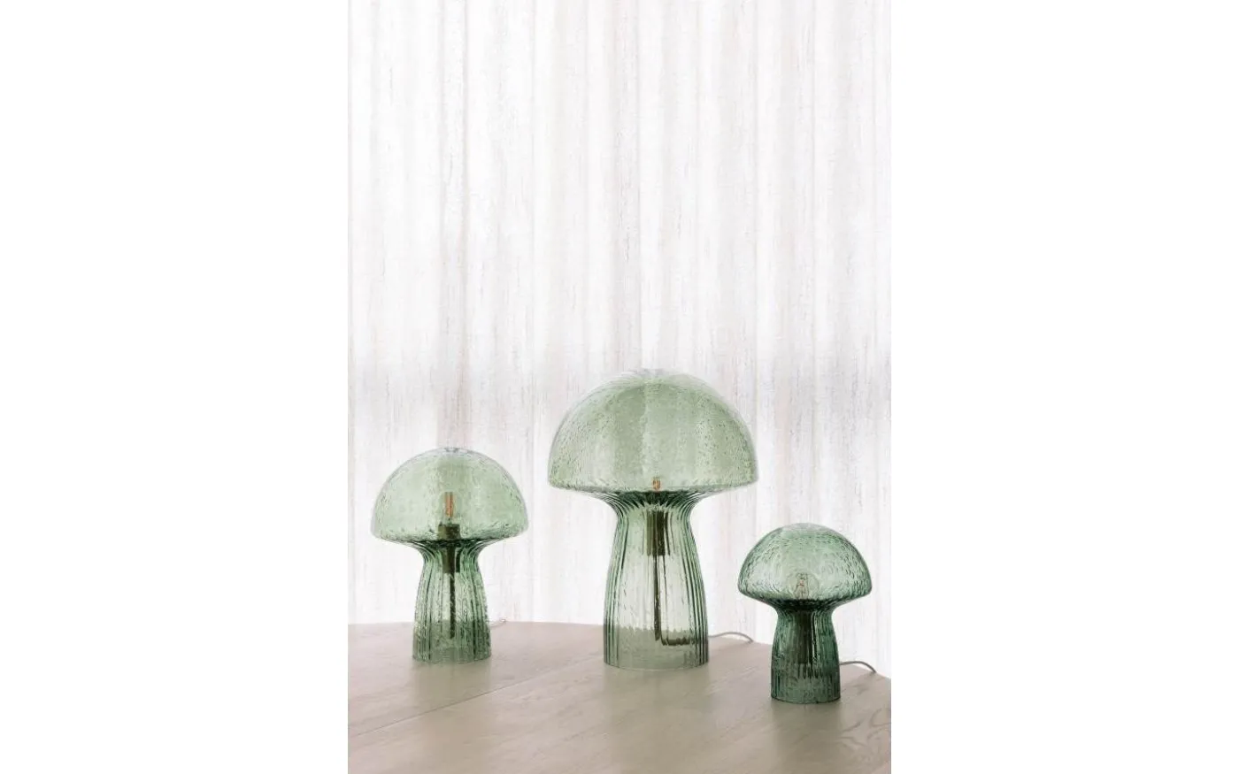 Fungo bordslampa från Globen Lighting är designad av GL Design Studio som med inspiration från skogen skapat denna nätta bordslampa avbildad som en svamp. Bordslampan är gjord av grönfärgat glas med räfflade detaljer på foten där räfflorna går hela vägen upp under hatten likt lamellerna på en skivling svamp. Bordslampan har en lamphållare i kontrasterande borstad mässingsfärgad metall och på glaset är där små vackra luftbubblor som ger en fin karaktär när lampan är tänd.