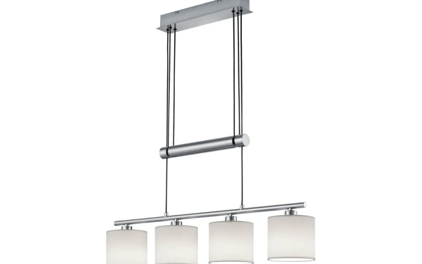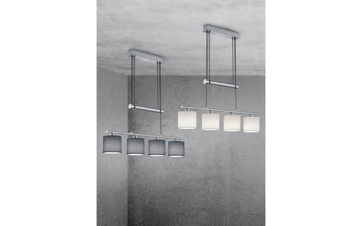 En absolut vardagshjälte och ändå ett dekorativt accessoar i hemmet. Pendellampan GARDA med fyra ljuskällor kan justeras i höjd för att passa dina behov och omständigheter. Den kan därför placeras ovanför vilket matbord som helst för optimal belysning. Upphängningslängden kan varieras mellan 95 cm och 150 cm. Den har en bredd på 77 cm och ett djup på 13,5 cm. Metallstommen i matt nickel och tygskärmarna i vitt harmoniserar särskilt bra tillsammans och passar bra in i en enkel och modern inredningsstil. För modern och pålitlig belysning rekommenderas en LED-lampa. Den erbjuder hög ljuskvalitet, är mångsidig och övertygar med jämn belysning. Dess långa livslängd och låga värmeutveckling gör den till det perfekta valet för en mängd olika användningsområden. Ljuskälla: exklusiv 4x E14 · max. 28W. Extra information: Justerbar höjd, IP20, Lampa(or) ingår ej