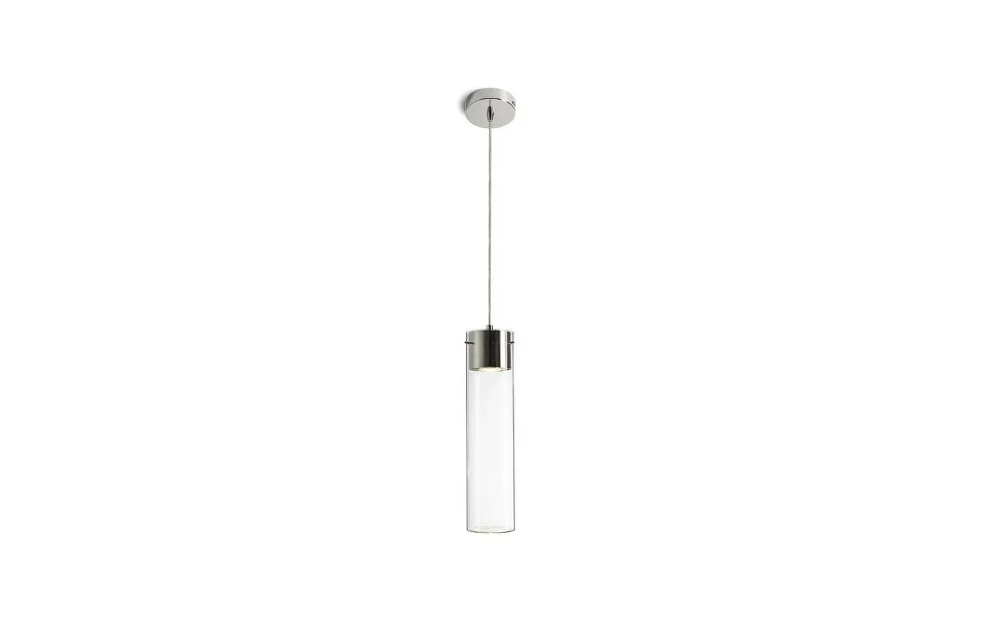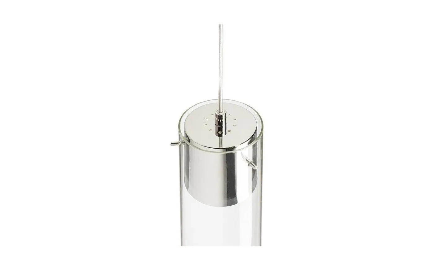 Taklampan är i form av en tub av klarglas med bas och detaljer i krom.