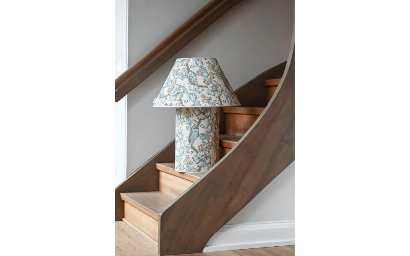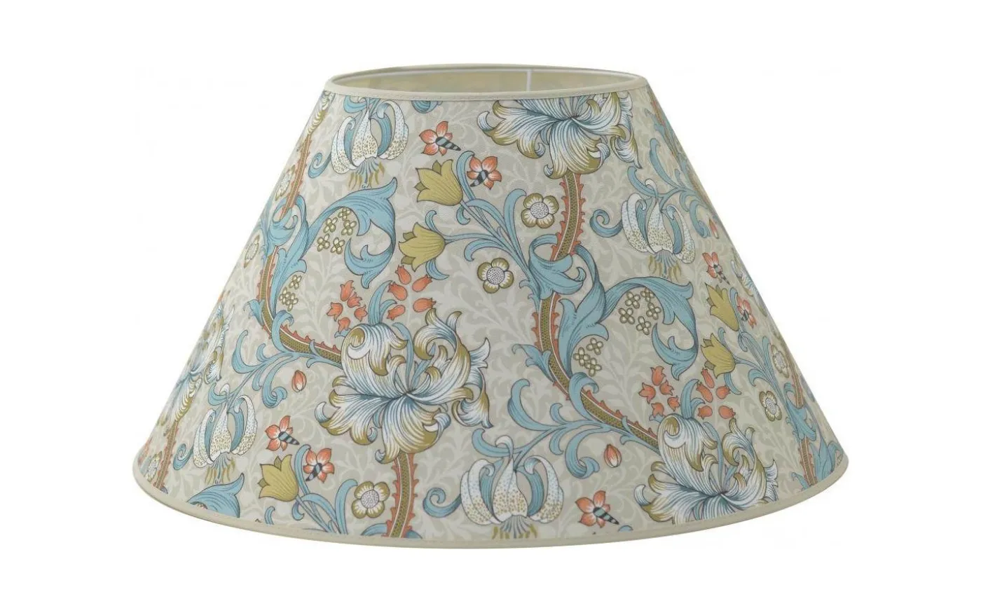 Golden Lily lampskärm Ø50 cm i färgen Teal är klädd i William Morris ikoniska mönster i blågröna nyanser. Med sin stora storlek blir den ett stilfullt blickfång som skapar en tidlös och elegant atmosfär i hemmet.