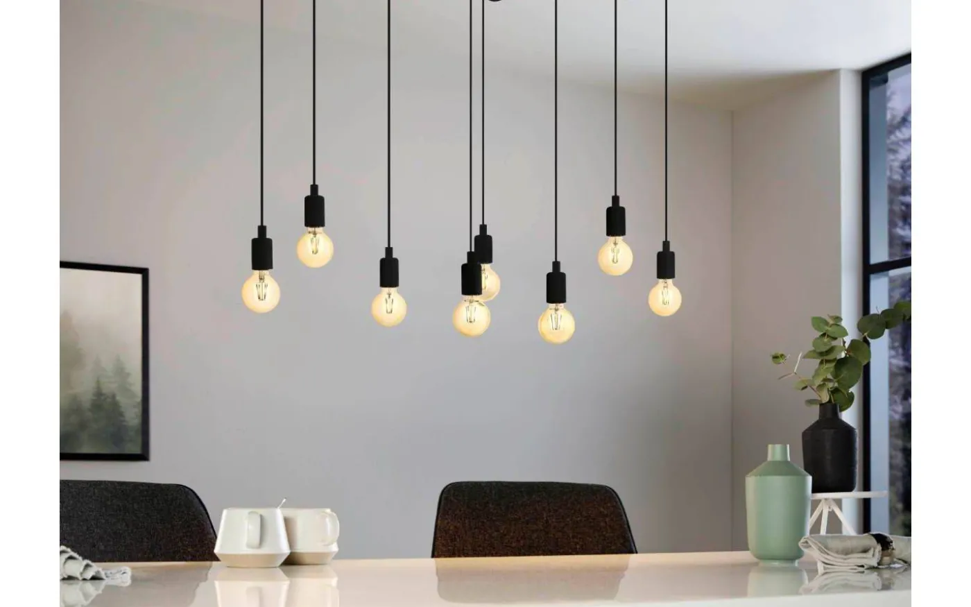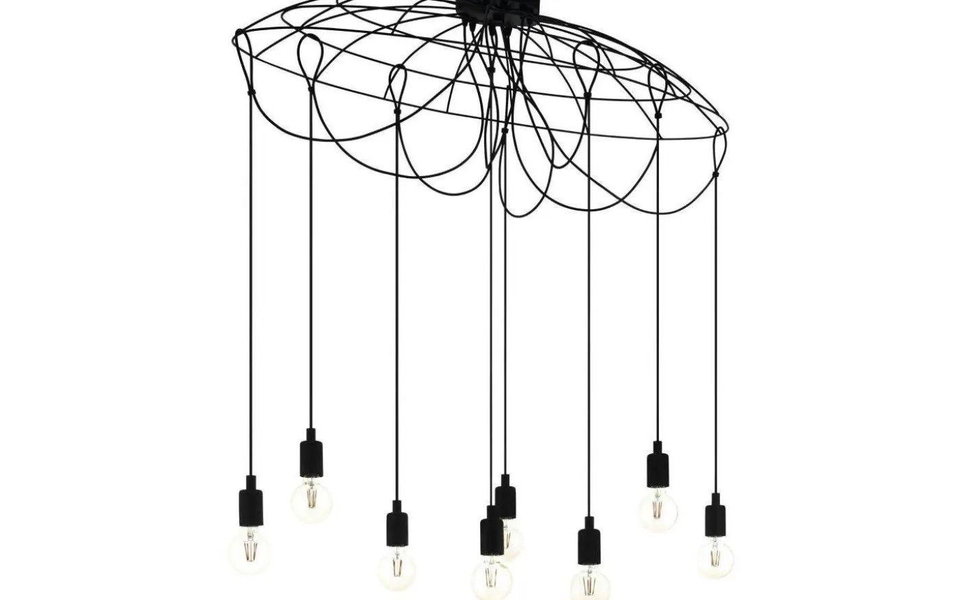 Hogsmill taklampa från Eglo är en vacker och härlig taklampa i stål med 8st nedpendlade lamphållare avstål med E27 sockel. Observera att denna produkt skruvas upp och har en fast anslutning, den går ej att montera på en takkrok.