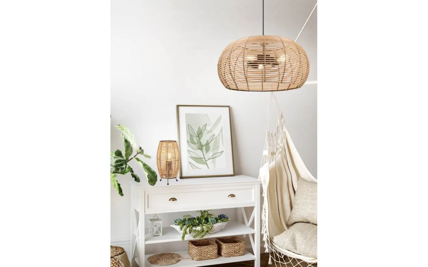 Naturmaterial är på modet – och det är även INGA-lampan! Pendellampan i tidlös rottingdesign är ett klassiskt måste. Pendellampan passar perfekt i köket ovanför matbordet eller i vardagsrummet ovanför vardagsrumsbordet och skapar en lugnande ljusatmosfär. Tack vare den naturliga rottingkonstruktionen och den mattsvarta metallen passar lampan in i alla inredningsstilar. För modern och pålitlig belysning rekommenderas en LED-lampa. Den erbjuder hög ljuskvalitet, är mångsidig och övertygar med en jämn belysning. Dess långa livslängd och låga värmeutveckling gör den till det perfekta valet för en mängd olika användningsområden. Ljuskälla: exklusiv 3x E27 · max. 40W. Extra information: Justerbar i höjd, Takmontering, IP20, Lampa(or) ingår ej