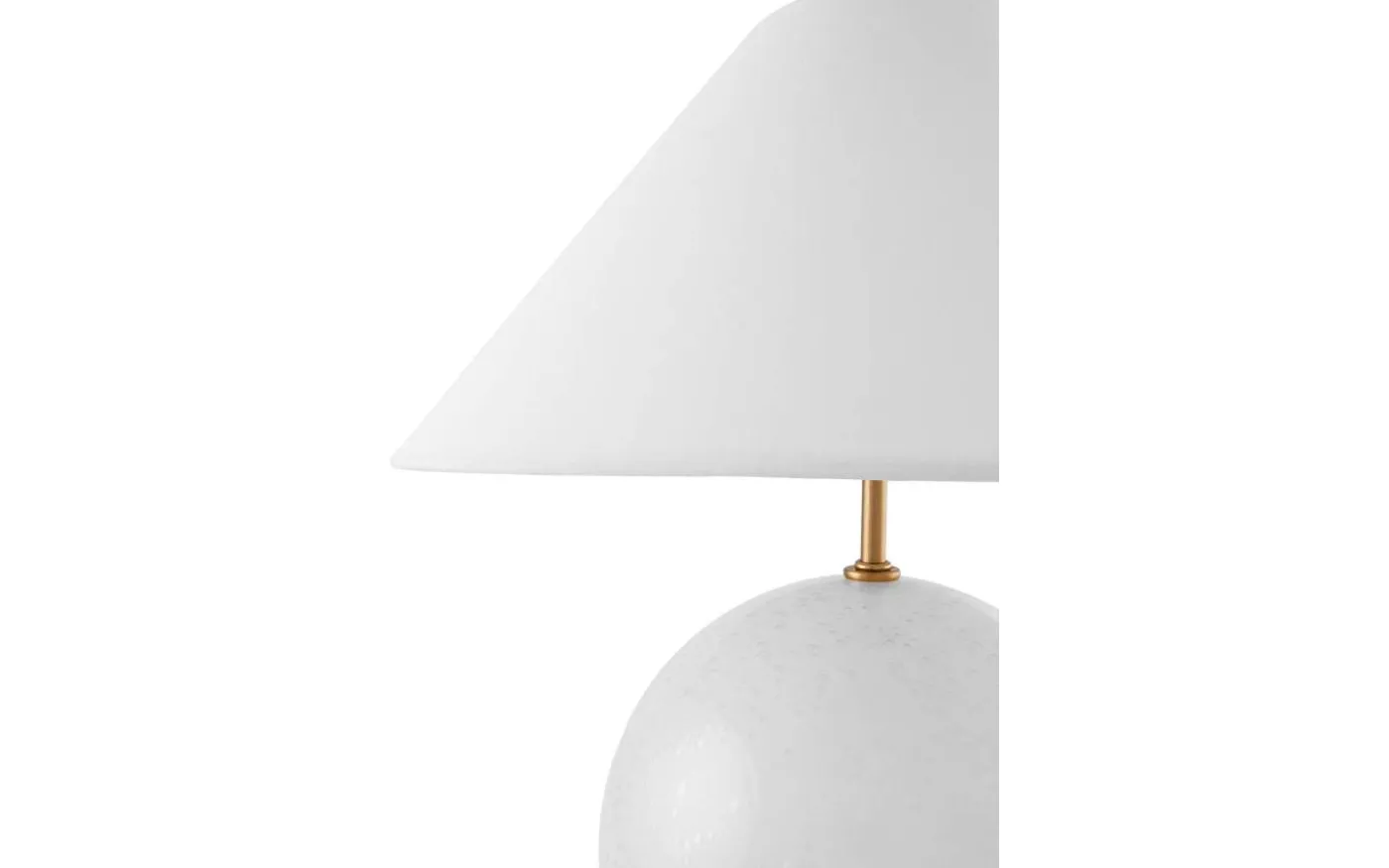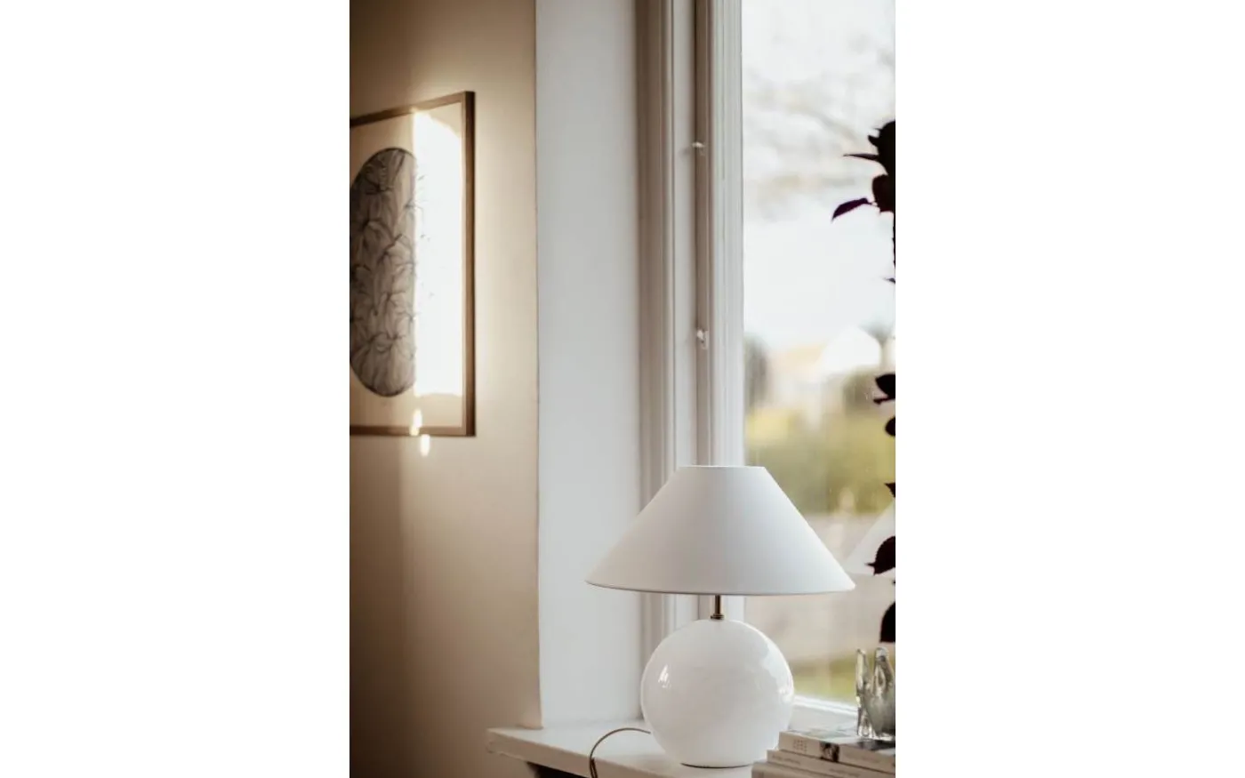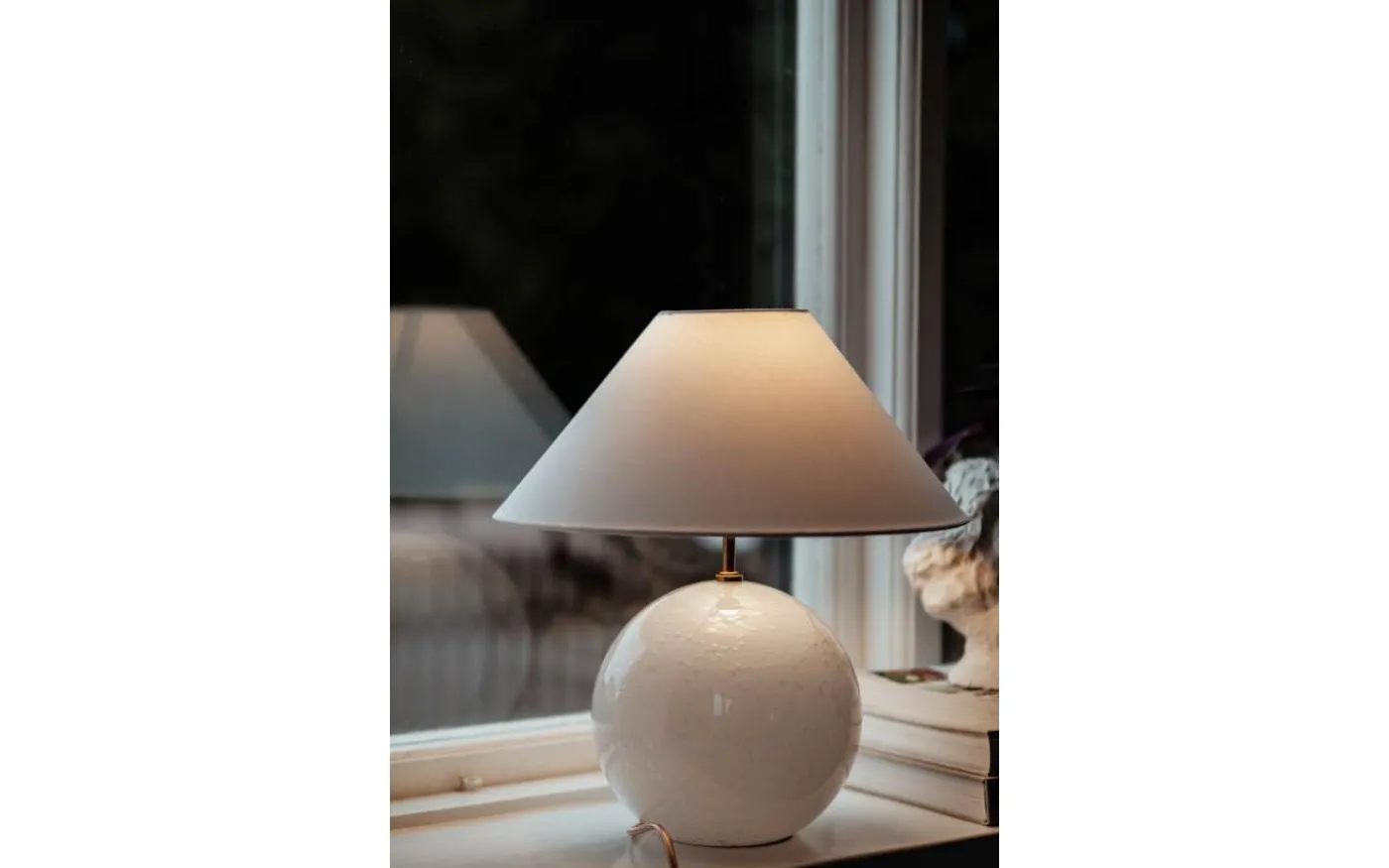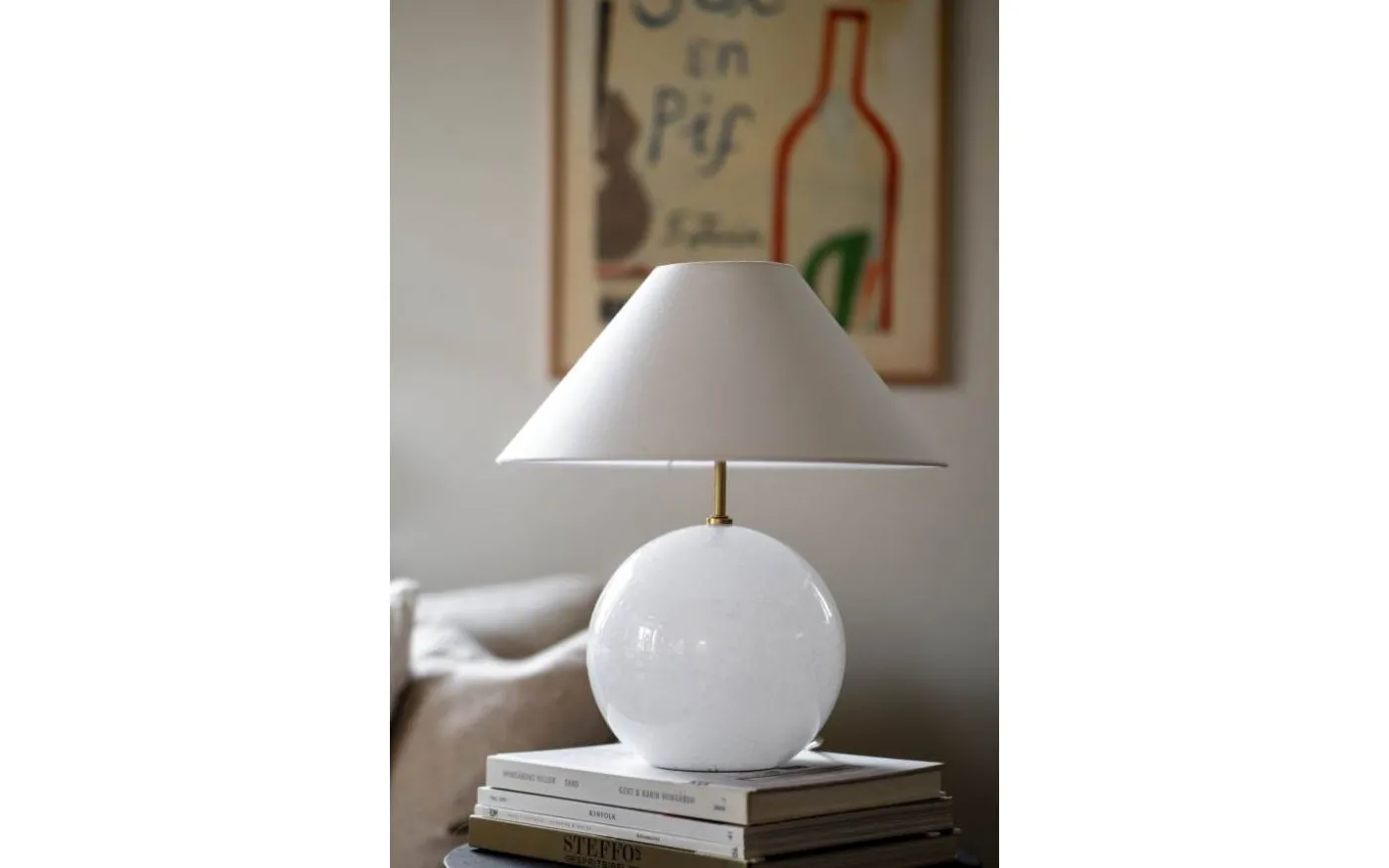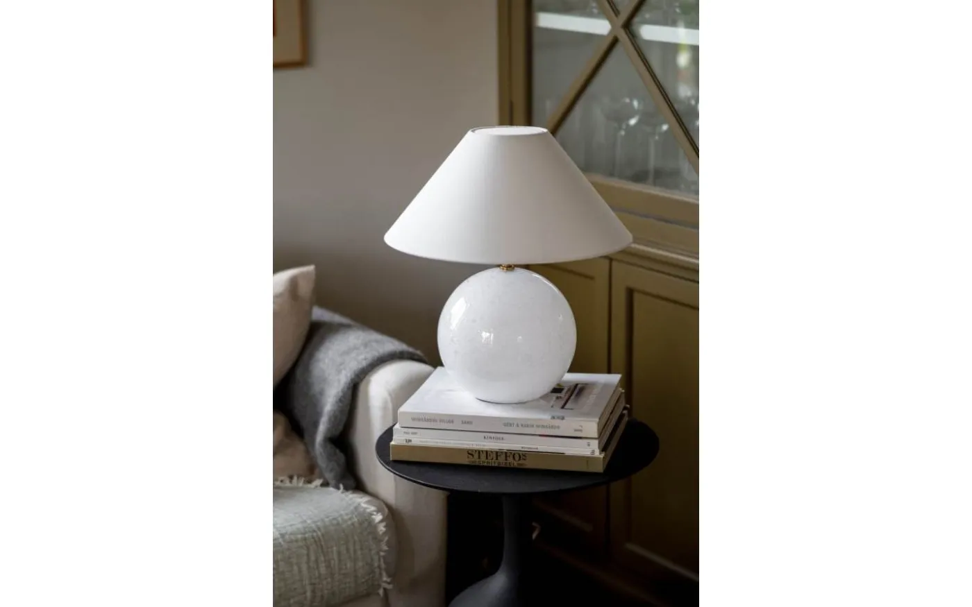 Iris från Globen Lighting är en charmig bordslampa med färgstark personlighet. Den har en rund lampfot i färgat glas med dekorativa luftbubblor och en matchande tygskärm i bomull. Varje lampa är unik tack vare glasets bubblor.