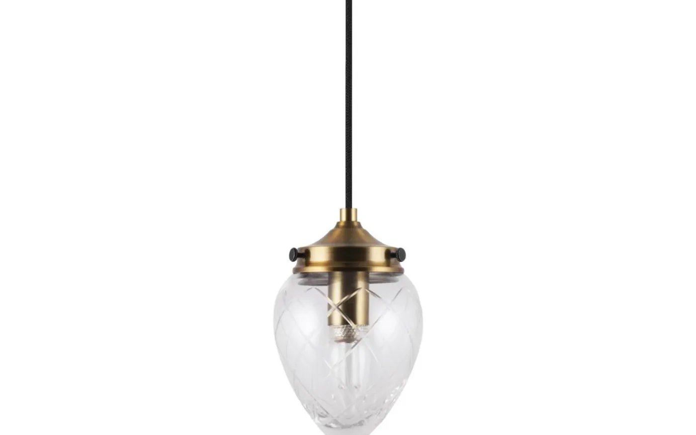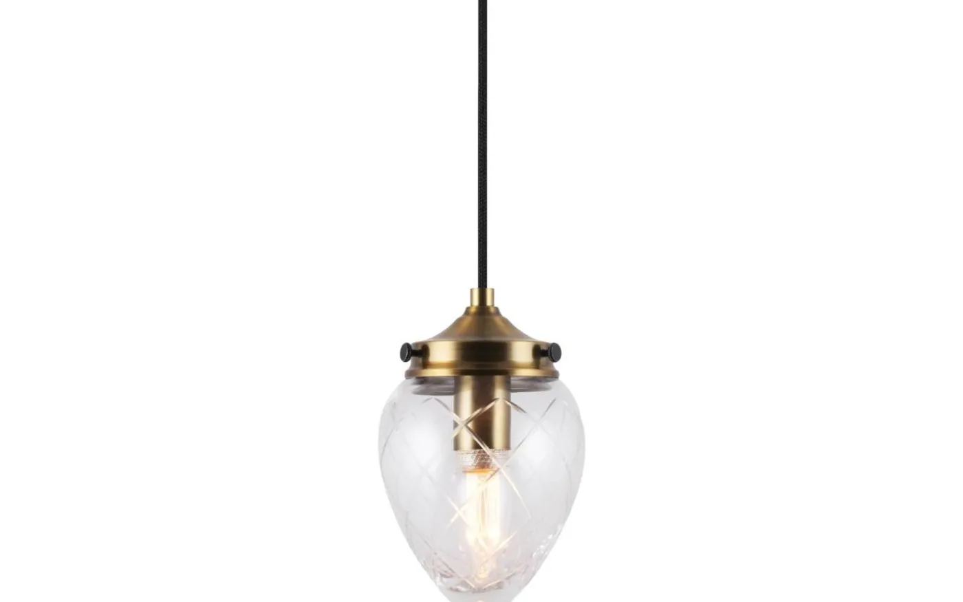 Vackra fönsterlampan Juni, från Globen Lighting, är en pendel med stomme i mässingsfärgad metall med en lite mörkade, slipad finish. Glaskupan är dropformad och gjord i klarglas med vackert rutmönster. En tidlös design som passar perfekt i det klassiska hemmet!
