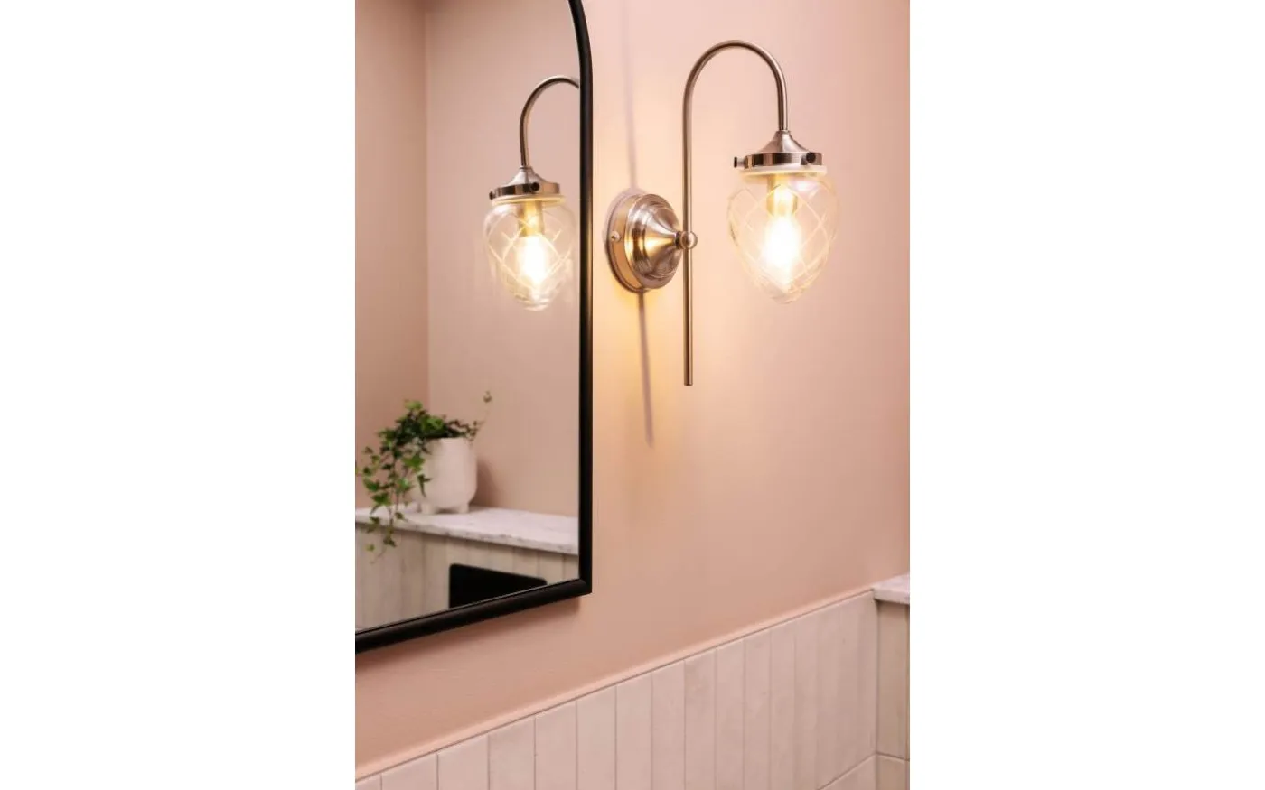 Juni från Globen Lighting är en vägglampa med stomme i stålfärgad metall och har en glaskupa som är dropformad och gjord i klarglas med vackert rutmönster.