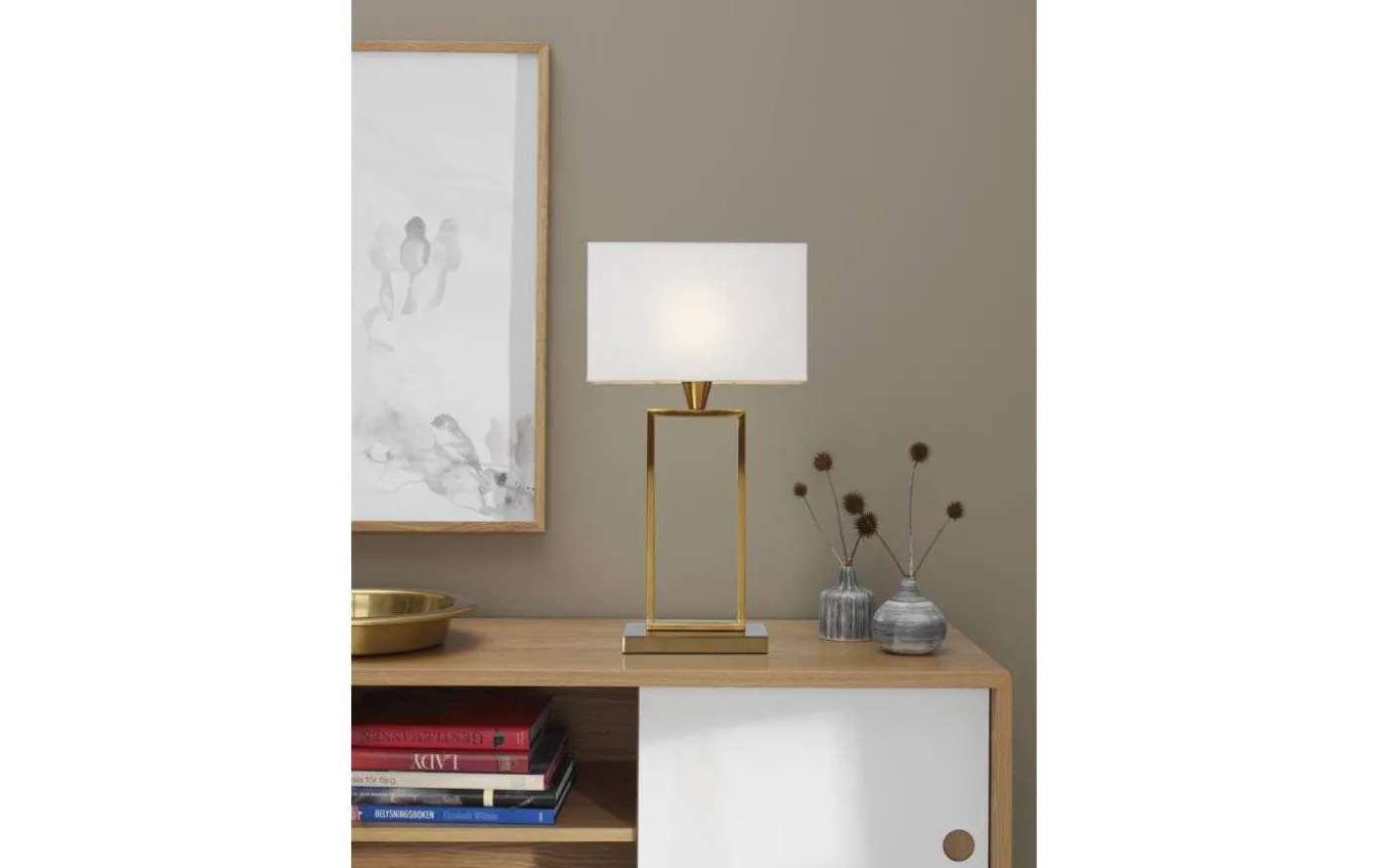 Stilrena bordslampan Kensington, från välkända Cottex, är en elegant bordslampa med fot i mässingsfärgad metall med en borstad finish kombinerat med en rektangulär skärm i vit textil.