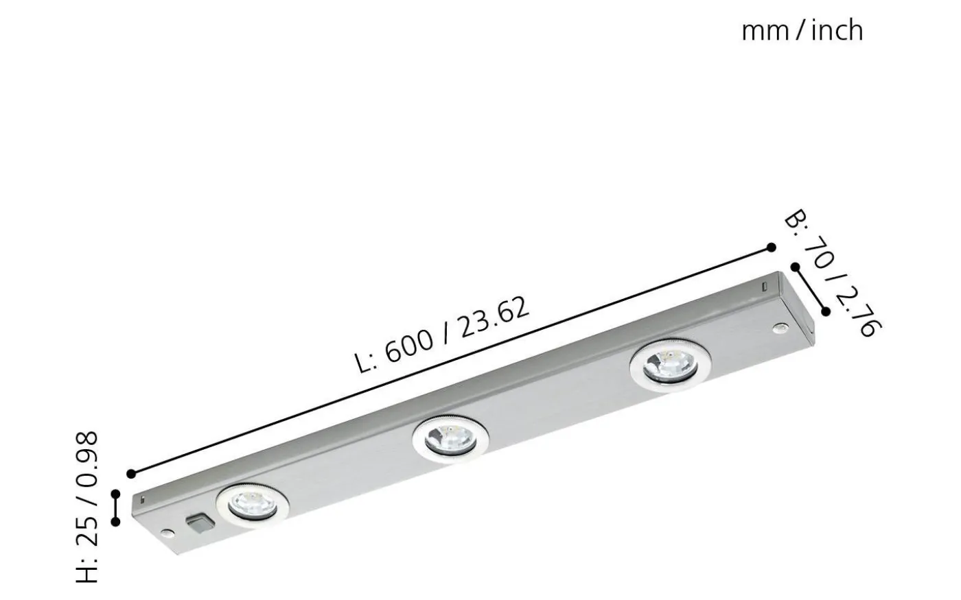 KOB LED-lampan under skåpet mäter 60 cm och har en matt nickelmetallfinish. Kökslampan har integrerade lysdioder bakom de tre runda ljuspanelerna som ger ett behagligt varmvitt ljus och kan tändas och släckas enkelt med en vippströmbrytare på höljet. Upp till tre lampor under skåpet kan kombineras med en kontakt, som ingår i varje paket. Produkten har en minimalistisk och modern design som smälter in i nästan alla hemstilar och ger perfekt belysning för köksbänkar.
