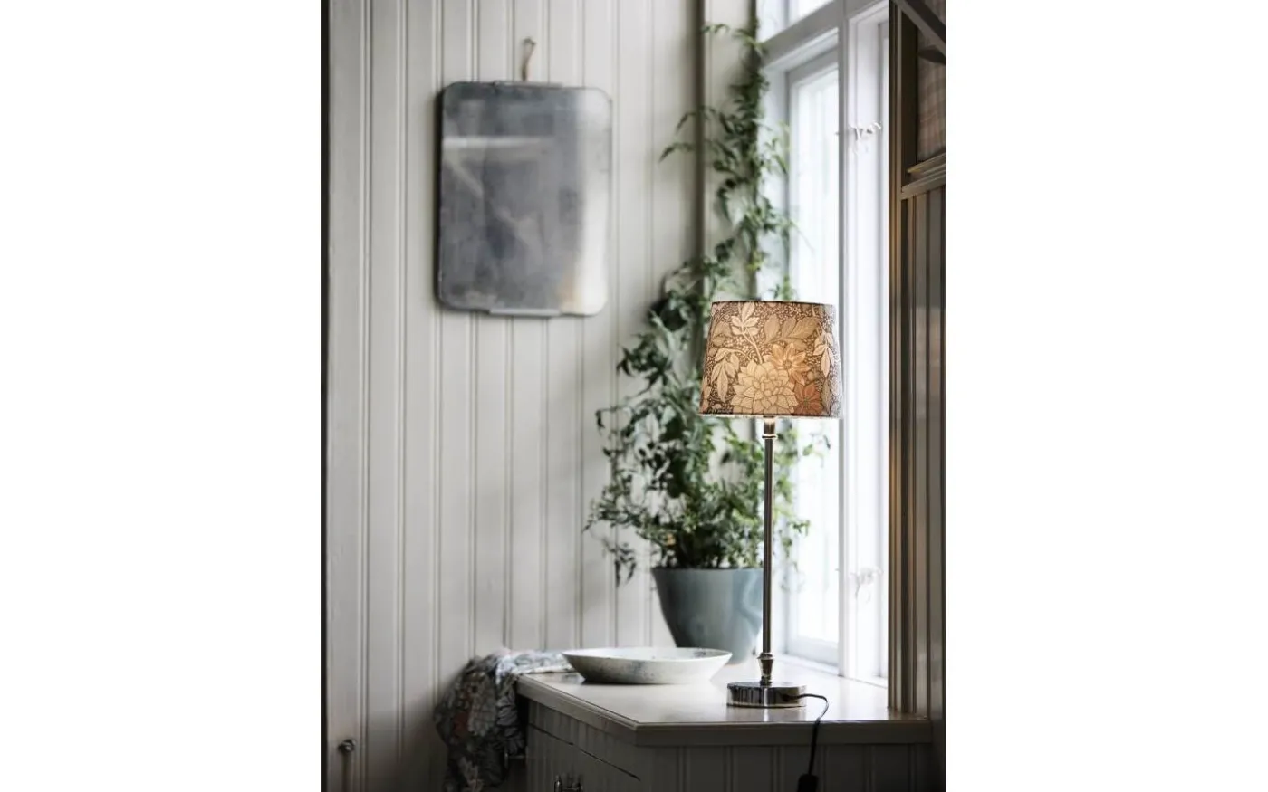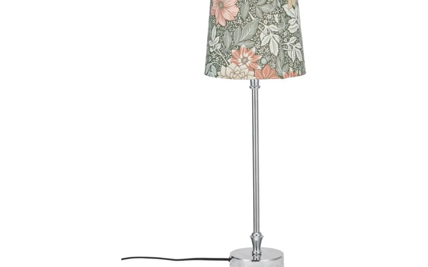 Liam bordslampa från välkända PR Home är en enkel och stilren bordslampa med lampfot i krom och vackert mönstrad lampskärm i textil.