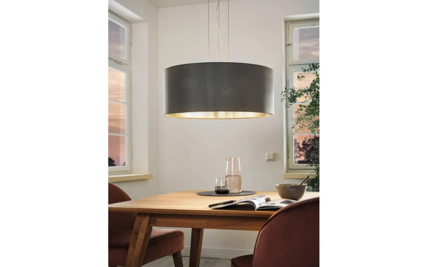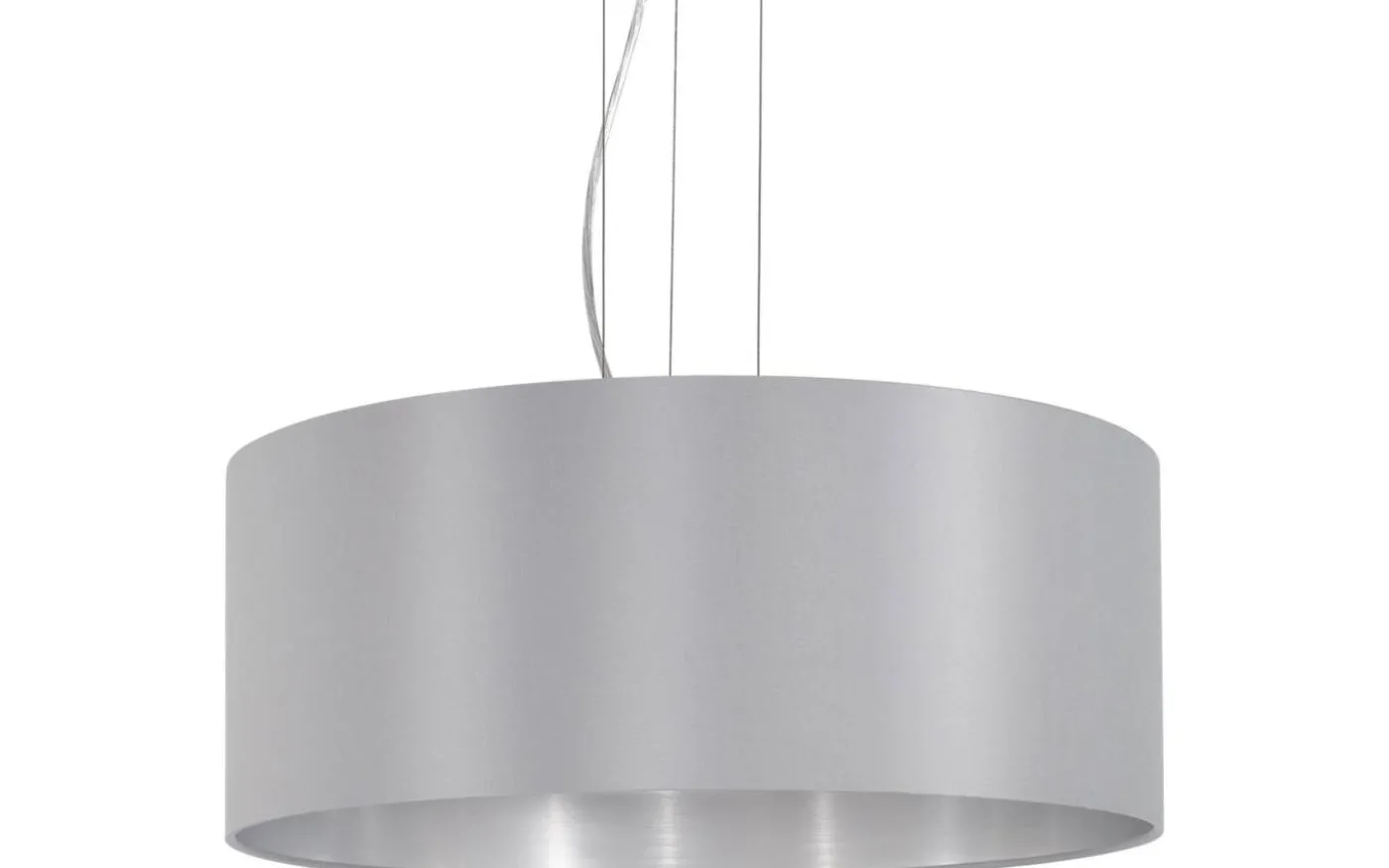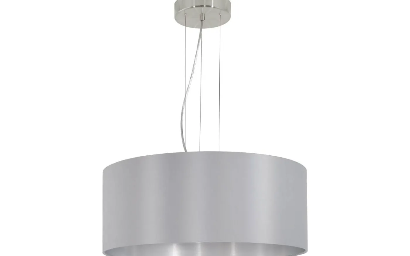 Denna pendelarmatur från serien MASERLO är gjord av satin nickelstål och tyg i färgerna grått och silver.