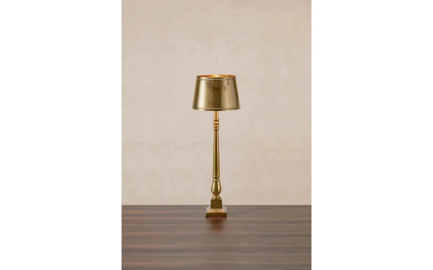 Bordslampa i klassisk stil med både skärm och fot tillverkade av metall med finish i antikfärgad mässing. Lampans skärm har en diameter om 23 cm och lampans totalhöjd om 66cm. Höjden gör att lampan passar fint på fönsterbrädan, skänken eller nattduksbordet style. Finns även i färgen antik silver.