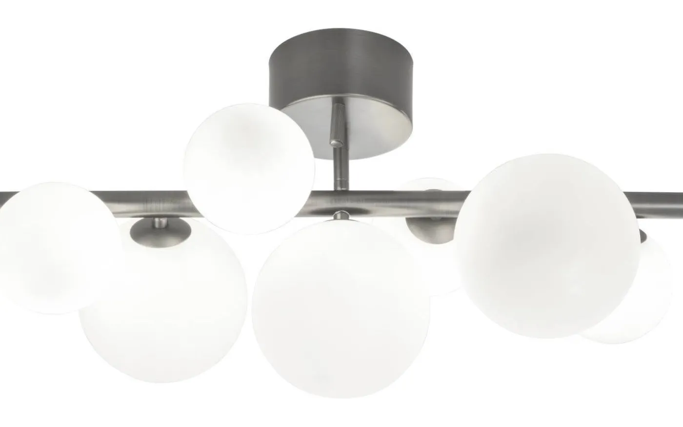 Molekyl trendig plafond i tennfärgad metall med 7 opalvita glaskupor i olika storlekar placerade på en 58 cm lång stång. Max 7x25W G9, ingår ej. Takkoppen är i metall för krokupphäng och med kopplingsplint, lamppropp kan monteras.