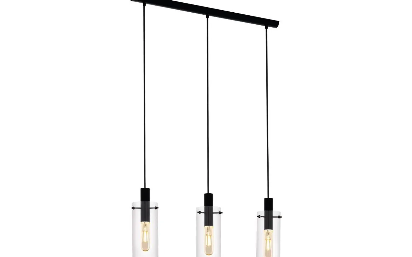 MONTEFINO taklampa har tre hängande klarglascylindrar med lamphållare i svart metall. Produkten har en långsträckt svart metallkapell och en synlig glödlampsstil. Pendellampan är den perfekta pricken över i:et för moderna inredningsstilar och skapar snygg belysning i vardagsrummet eller matsalen.