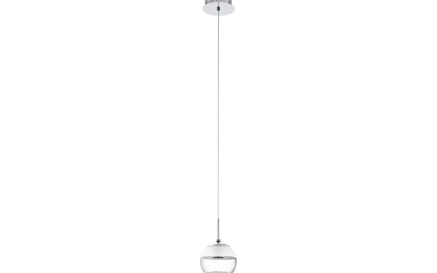 MONTEFIO 1 LED-pendellampa har ett sfärisk huvud gjort av klart och satinglas. Designen har ett runt, kromfärgat takfäste i metall, och lampskärmen innehåller inre kristaller. De högkvalitativa glaskristallerna skapar ett gnistrande, exklusivt utseende när ljuset är på, medan de integrerade lysdioderna ger ett behagligt varmvitt ljus. Denna taklampa är den perfekta pricken över i:et för moderna interiörer och skapar en distinkt belysning i vardagsrummet eller ovanför bordet i matsalen.