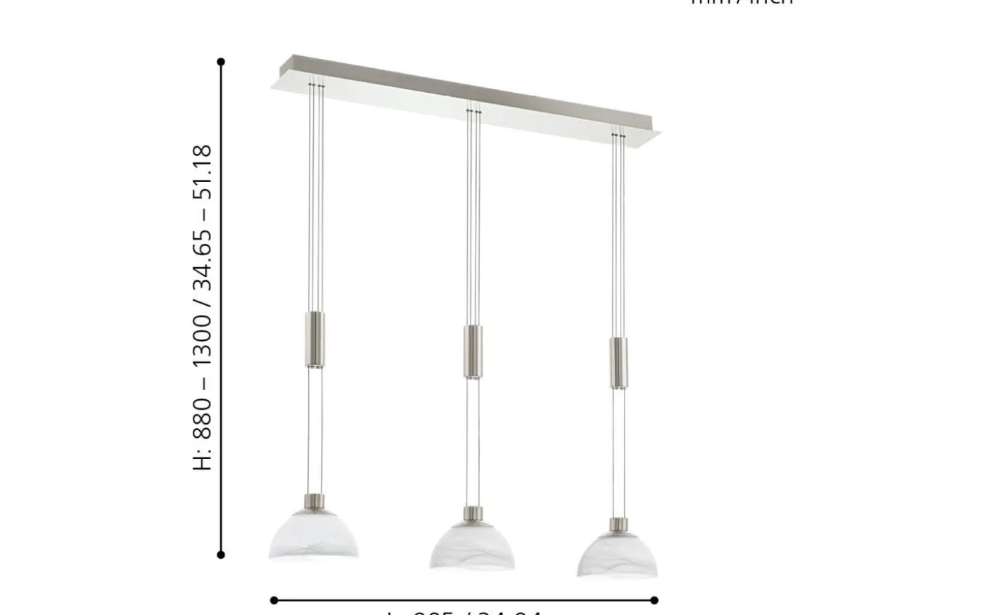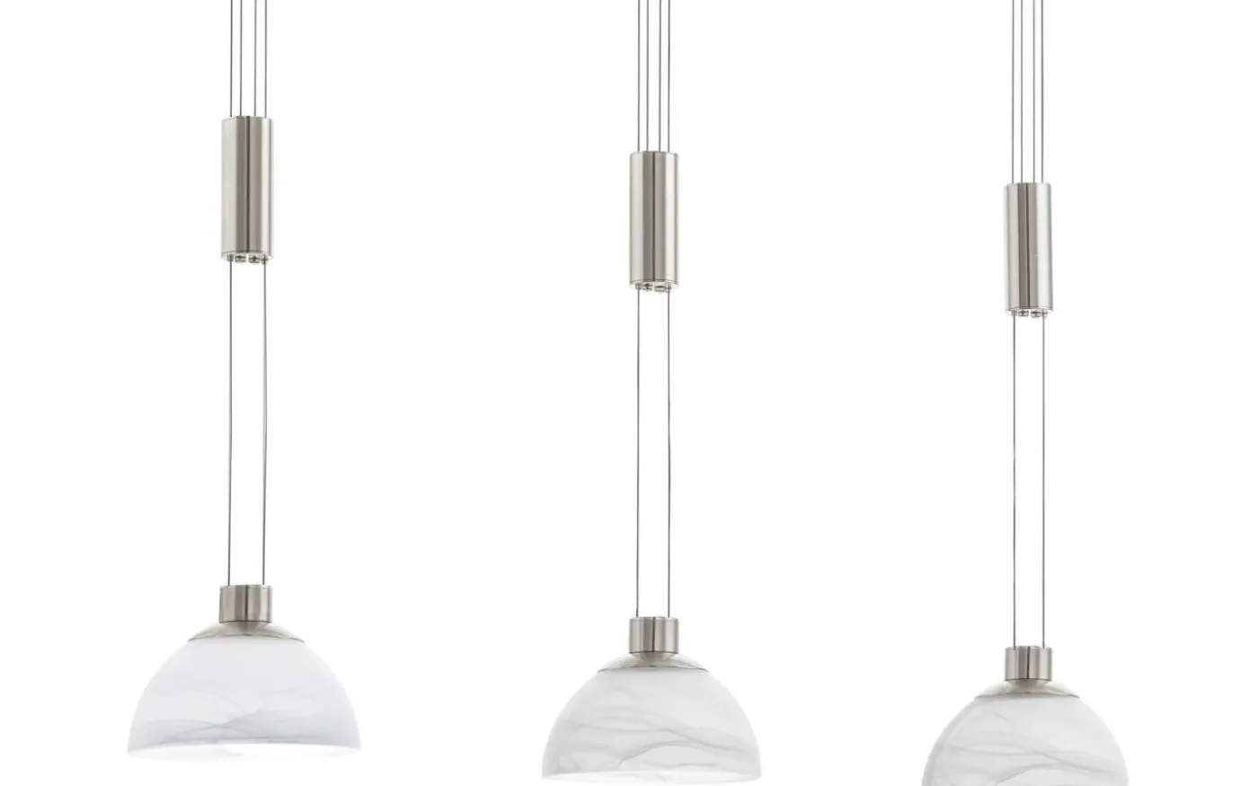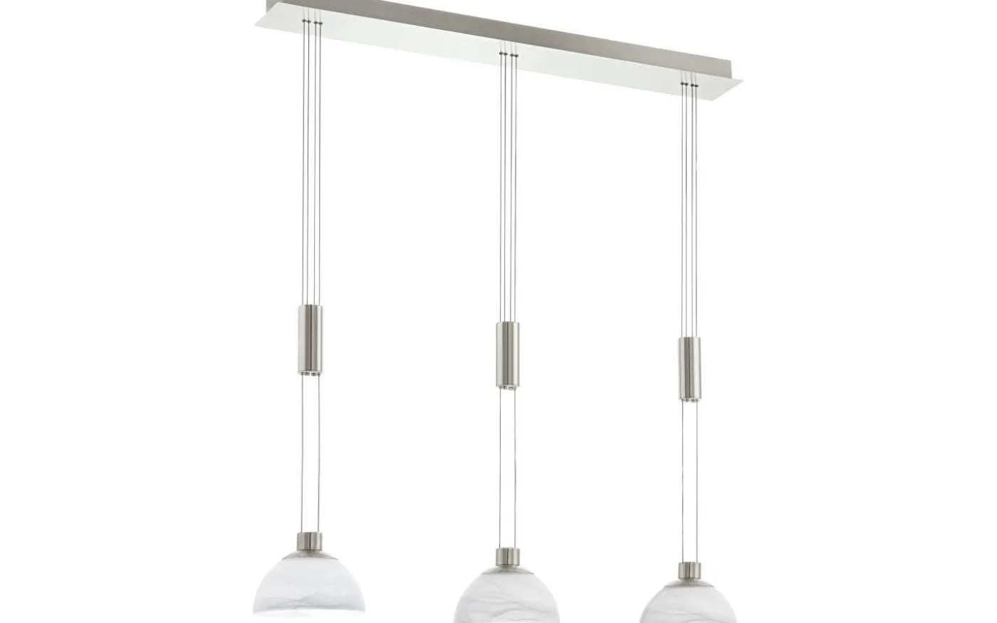 Denna nedpendlade armatur från MONTEFIO-serien är gjord av satin nickel rostfritt stål och vitt alabasterglas. Den är justerbar i höjdled, har skyddsisolering och är utrustad med tre utbytbara LED-lampor för ett varmvitt ljus.