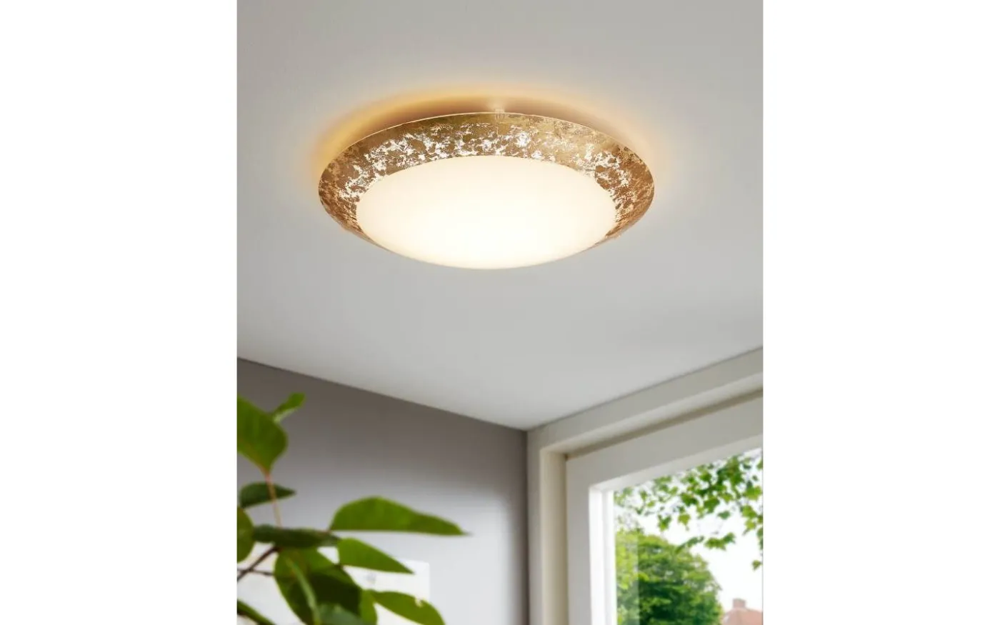 MONTENOVO LED-taklampan har en rund vit glaskåpa med dekorativ kant med bladguld-stil. De integrerade lysdioderna ger ett behagligt varmvitt ljus och produkten har en klassisk stil som kompletterar eleganta och moderna interiörer. Taklampan ger mysig belysning till vardagsrum, sovrum, hallar eller matsalar.