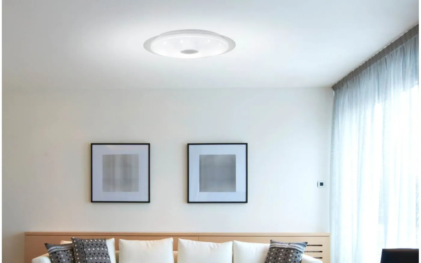 MORATICA-A LED-taklampan är en del av det fjärrstyrda Access-sortimentet. Designen har en rund vit plastkåpa med en klar kant och en vit metallbas. När ljuset är på skapar det en gnistrande effekt som stjärnor på natthimlen. De integrerade lysdioderna ger ett behagligt, anpassningsbart ljus. Du kan välja mellan varmvitt, neutralvitt och kallvitt ljus. Ljuset kan styras med hjälp av den medföljande fjärrkontrollen, som även erbjuder andra funktioner som justering av ljusstyrkan, en nattlampa och en timer (släcks efter 30 minuter), plus två förinställda belysningslägen. Du kan också använda den medföljande fjärrkontrollen för att styra upp till åtta Access-lampor samtidigt och spara anpassade ljusinställningar. Med en diameter på 56 cm smälter taklampan sömlöst in i moderna och minimalistiska interiörer och ger stilfull belysning för alla utrymmen, oavsett om det är i köket, vardagsrummet, sovrummet eller hallen.