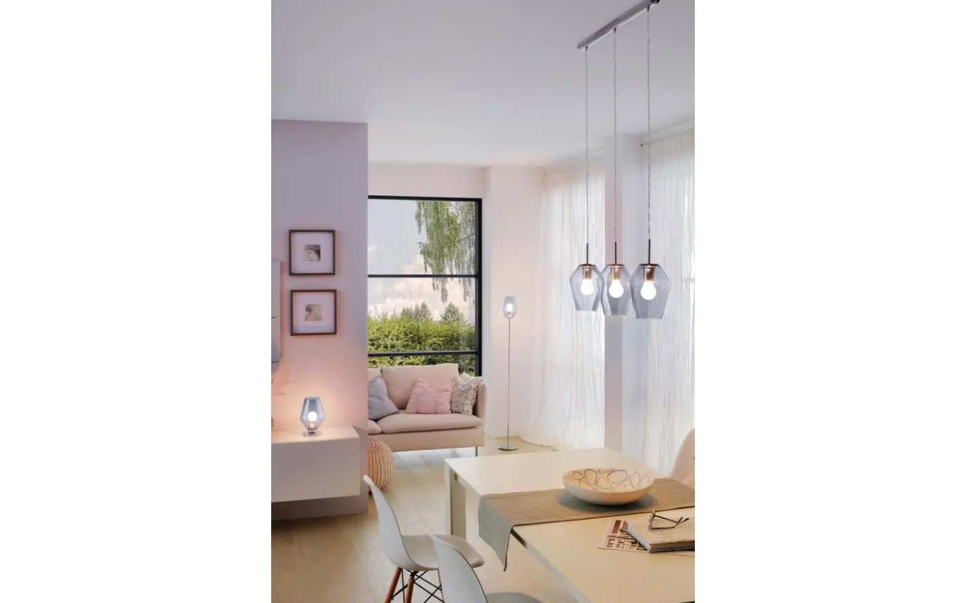 MURMILLO taklampa har tre koniska lampskärmar av rökt svart glas upphängda i en långsträckt kromfärgad metalltak. Pendellampan är den perfekta pricken över i:et för moderna och minimalistiska interiörer och skapar mysig belysning för ditt utrymme, oavsett om det är i vardagsrummet eller över ett långbord i matsalen.