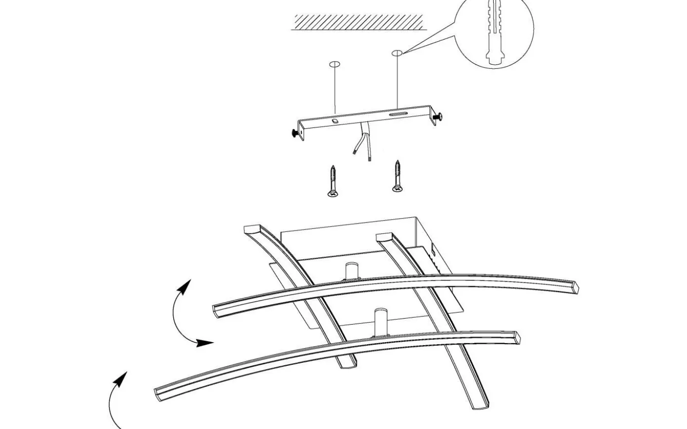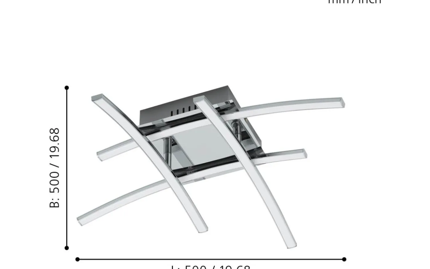 NEVADO LED-taklampan har en krom aluminiumfinish med fyra mjukt böjda profiler monterade i ett förskjutet arrangemang på en metallsockel. De integrerade lysdioderna under de vita plastkåporna ger ett behagligt varmvitt ljus. Med sin minimalistiska och moderna design ger produkten snygg belysning för alla utrymmen, oavsett om det är i köket, vardagsrummet, sovrummet eller hallen.