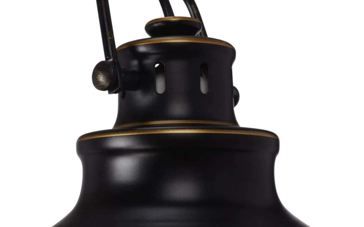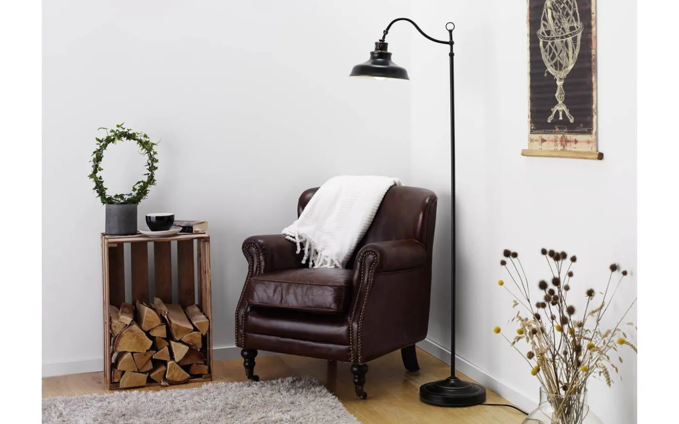 New Haven Golvlampa, från Cottex, har en rustik och industriell design kombinerat med en stilren finish. Färgen är matt antiksvart med guld detaljer och en vit insida. Gör sig perfekt bredvid fåtöljen eller vid soffan både som läs- och stämningsfull lampa.