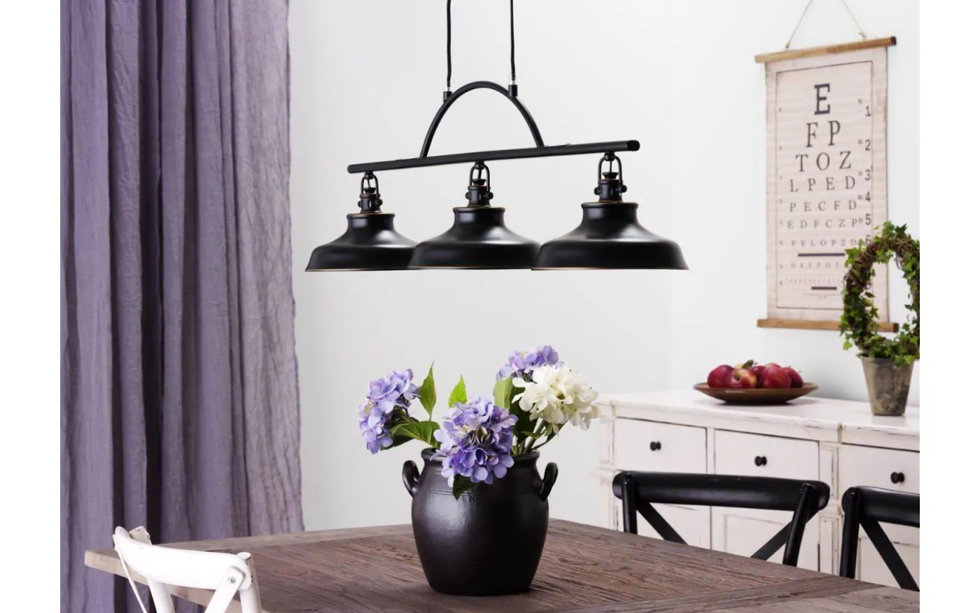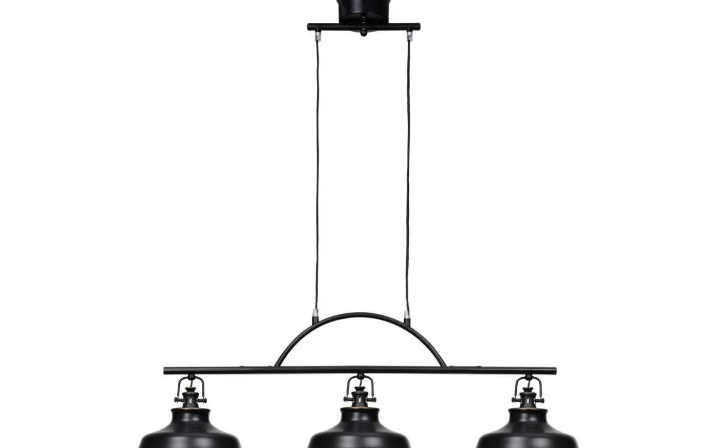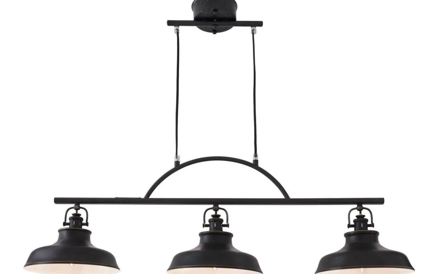 Denna taklampa har en rustik och industriell design kombinerat med stilren finish! Färgen är matt, antiksvart med gulddekor och vit insida. Denna modellen har tre lampskärmar och gör sig riktigt bra över köksbordet eller över en köksö i det rustika köket.