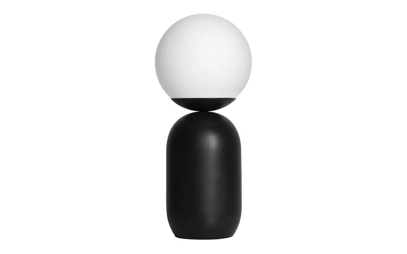 Notti bordslampa från danska Nordlux. De fina formerna återspeglar en elegant design. Den stora kupolformade glasskärmen i opalvitt glas utgör en fin kontrast till den lätta metallsockeln som bidrar till visuell volym och ett mjukt ljus.